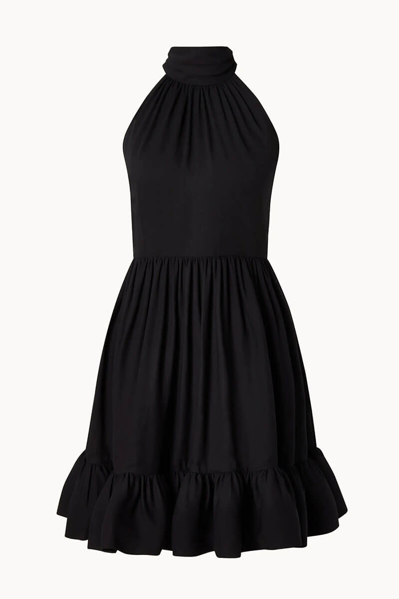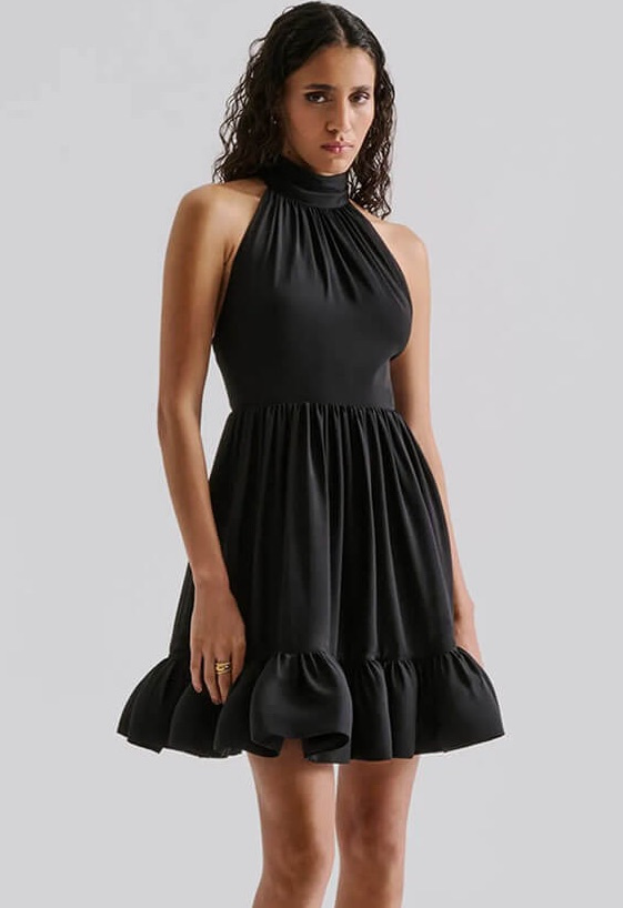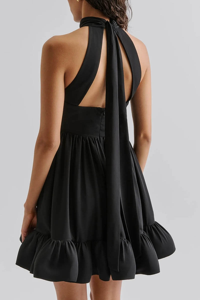 A halterneck mini dress featuring an open back, ruffled skirt, and defined waist that ties at the neck. True to size.