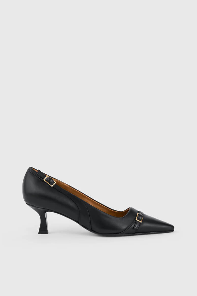 Sculpted pumps in black leather with a pointed toe and gold buckle - elegance with attitude. Wear them with long skirts, ripped jeans or suit trousers. The perfect heel height to take you from breakfast to bar without compromise.Pumps in soft leather with decorative gold-colored buckles, short heel and pointed toe from ATP Atelier.