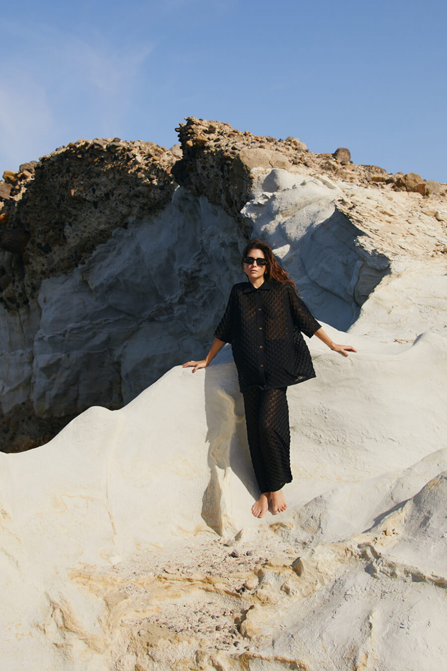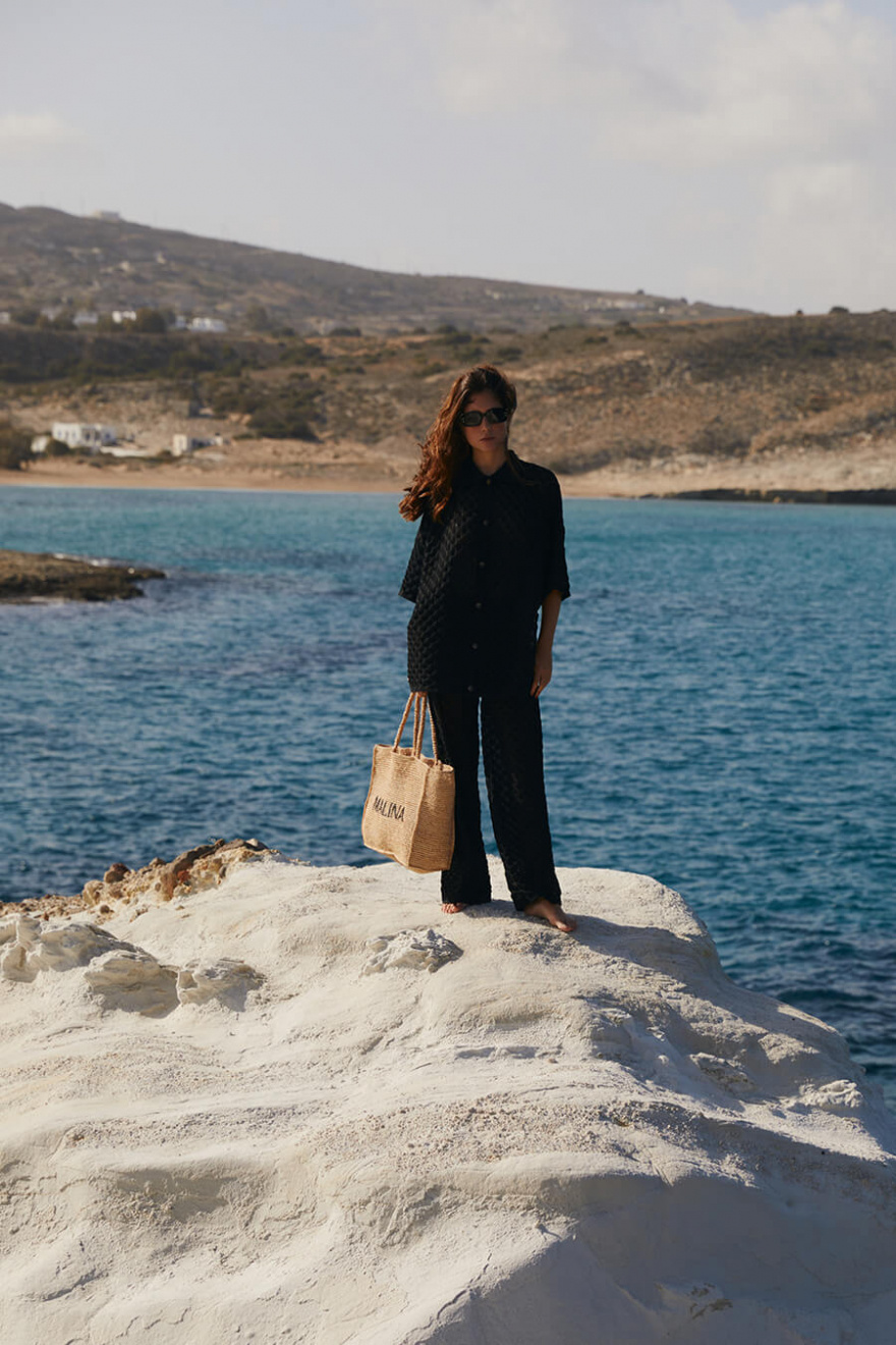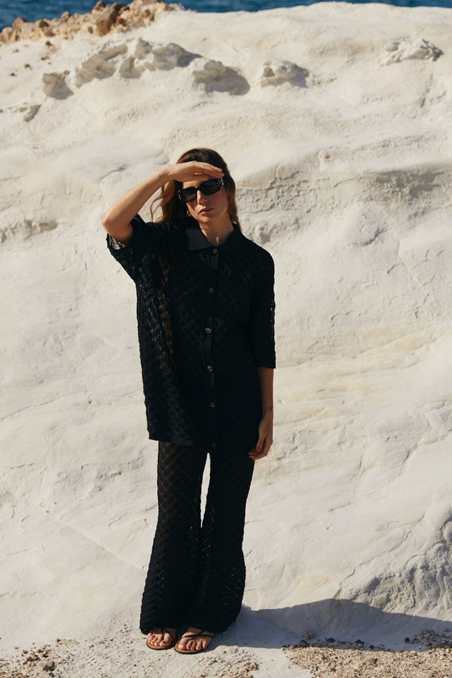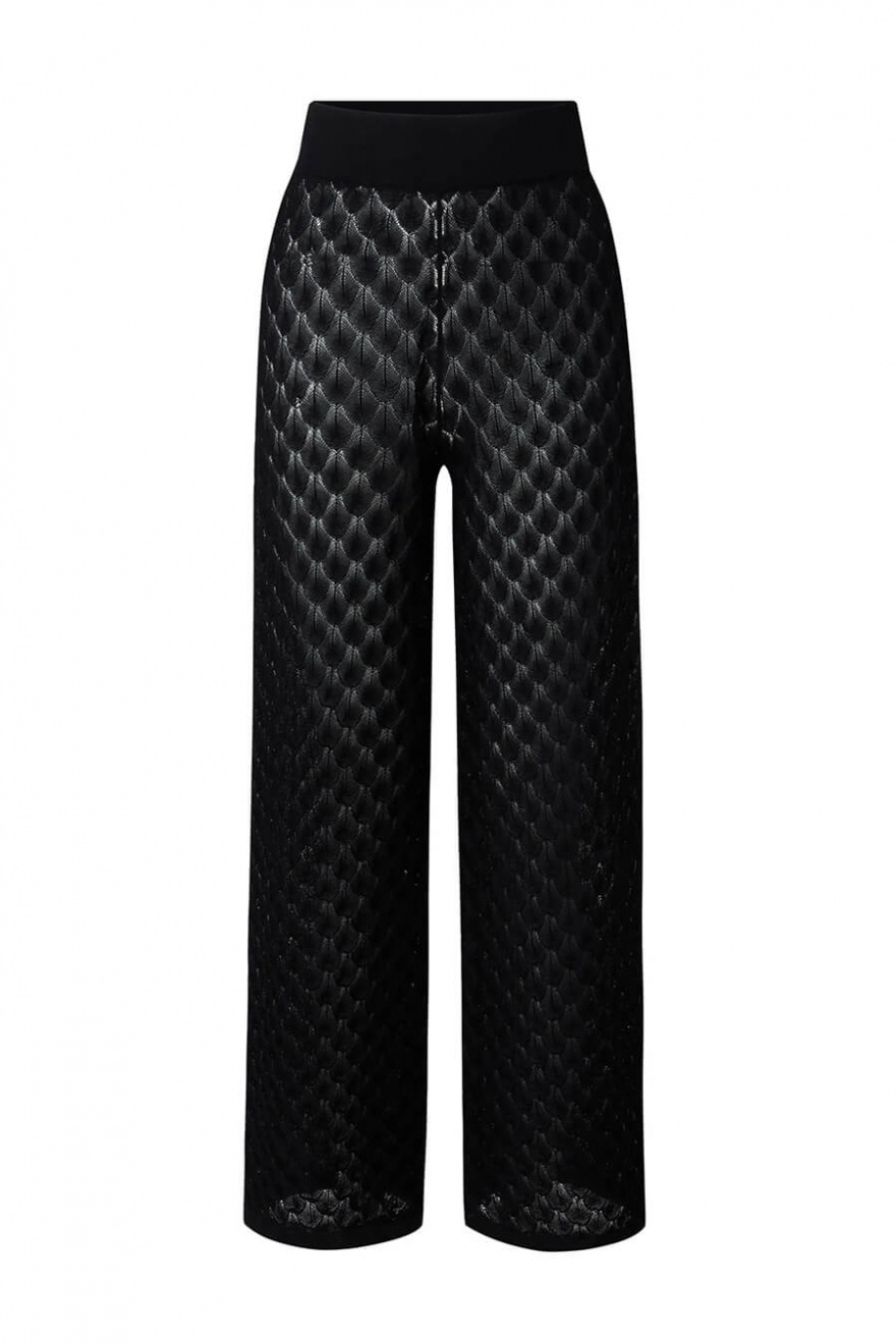 Black crochet pants with high waist and wide legs - a dream in texture and silhouette. As obvious on the beach as in town, styled with an oversized shirt or a simple top. A timeless investment for summer!Crocheted trousers in a viscose blend with a high waist, elastic waistband, wide legs and slightly transparent from Malina.