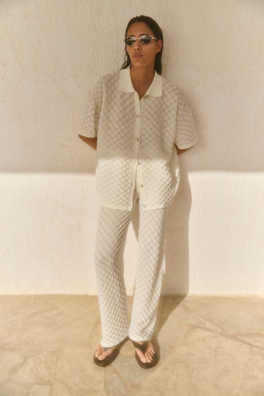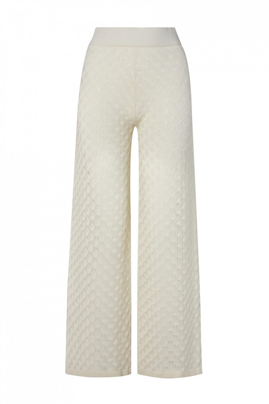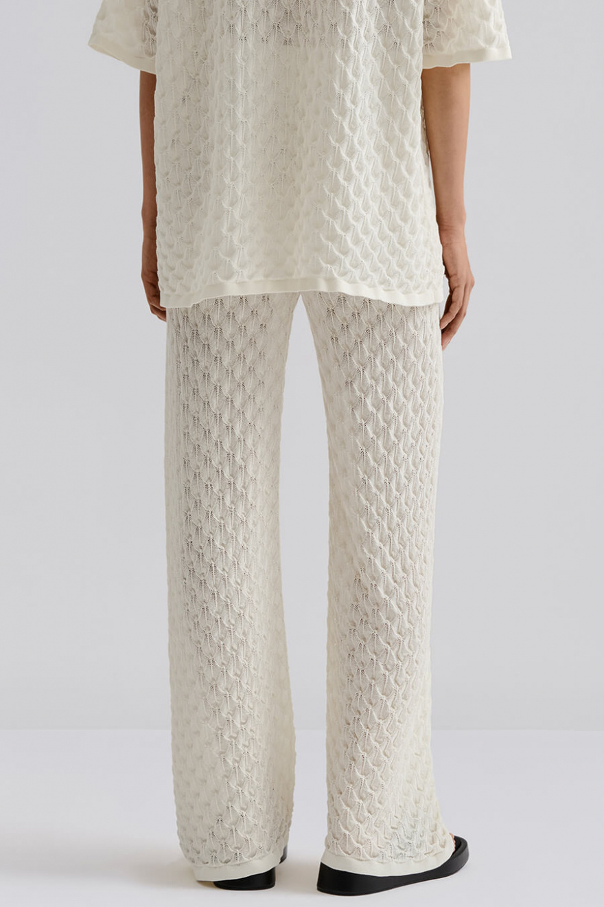 Crochet pants with high waist and wide legs - a dream in texture and silhouette. As obvious on the beach as in town, styled with an oversized shirt or a simple top. A timeless investment for summer!Crocheted trousers in a viscose blend with a high waist, elastic waistband, wide legs and slightly transparent from Malina.