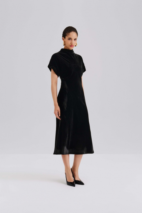 An elegant midi dress in soft velvet with sophisticated draping. The high, gathered neckline and short sleeves create a balanced silhouette with timeless appeal. Perfect for autumn dinners and festive occasions – pair with heels and subtle jewelry for a classically chic look.
