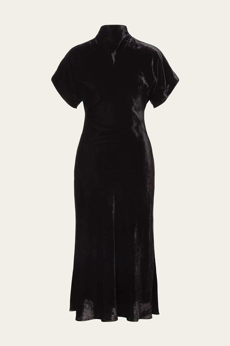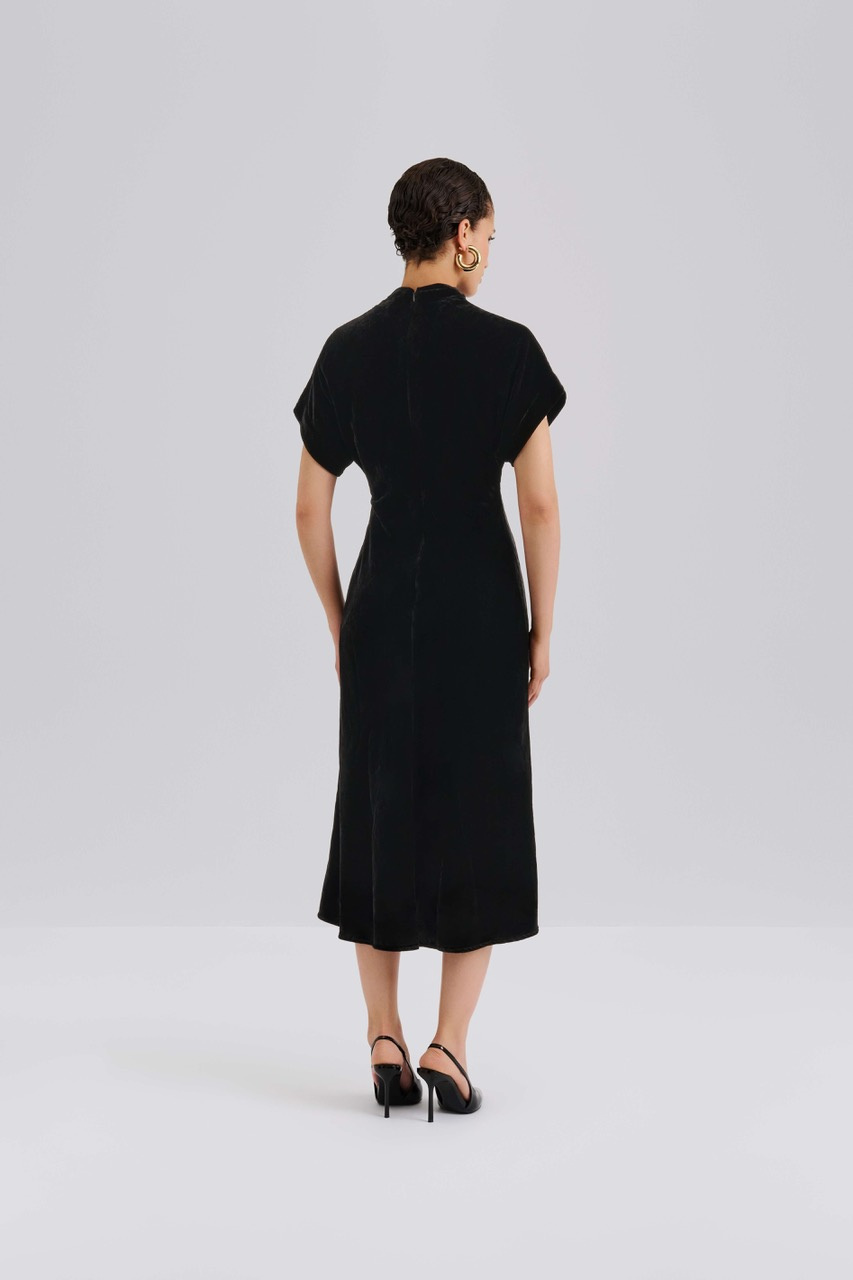 Velvet midi dress with short sleeves, high draped neckline, and concealed zippers at the back and side seam.