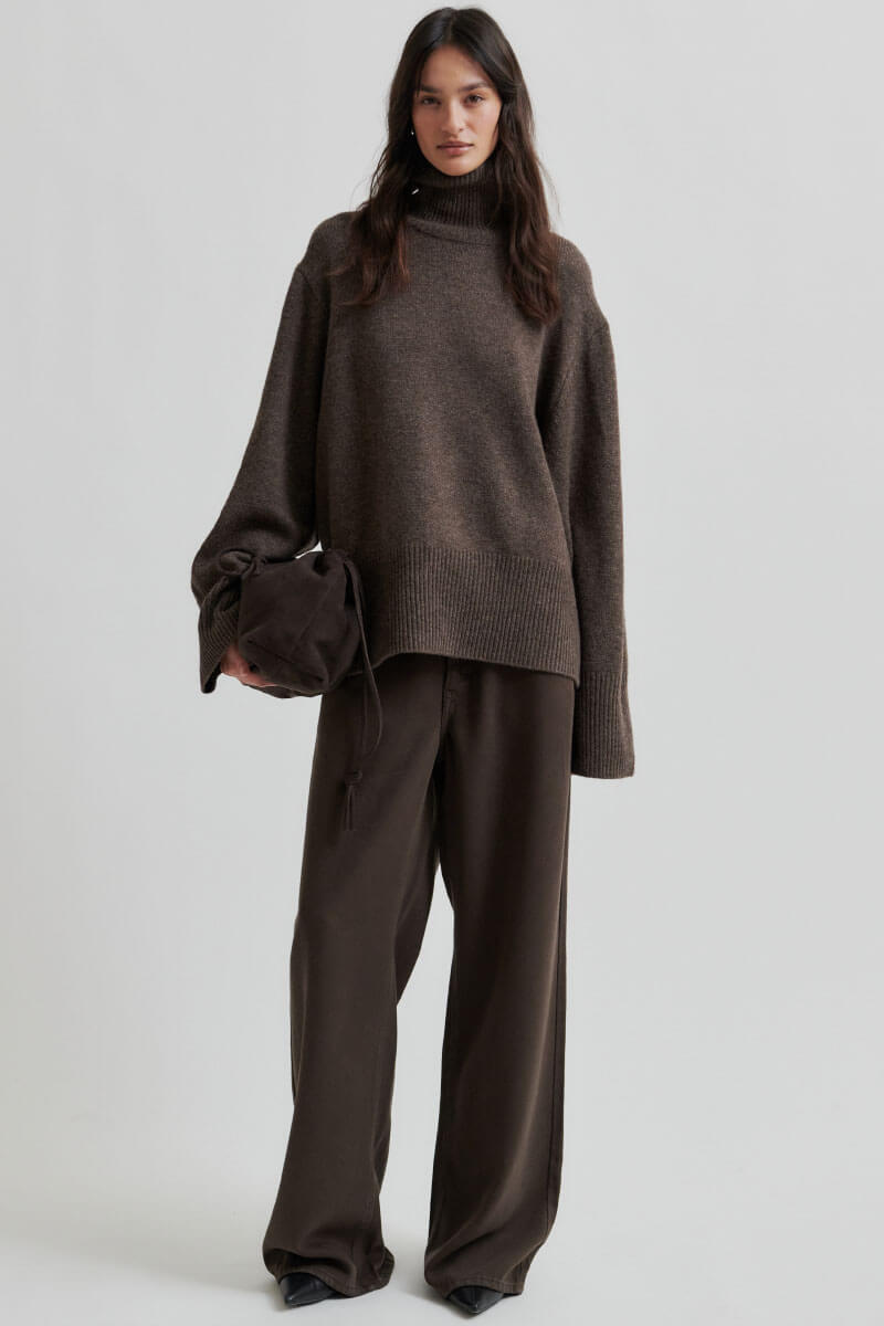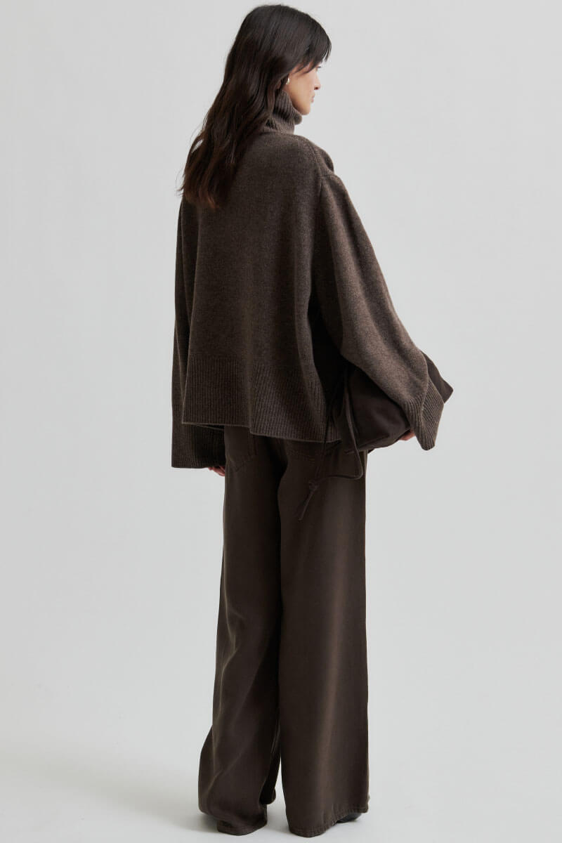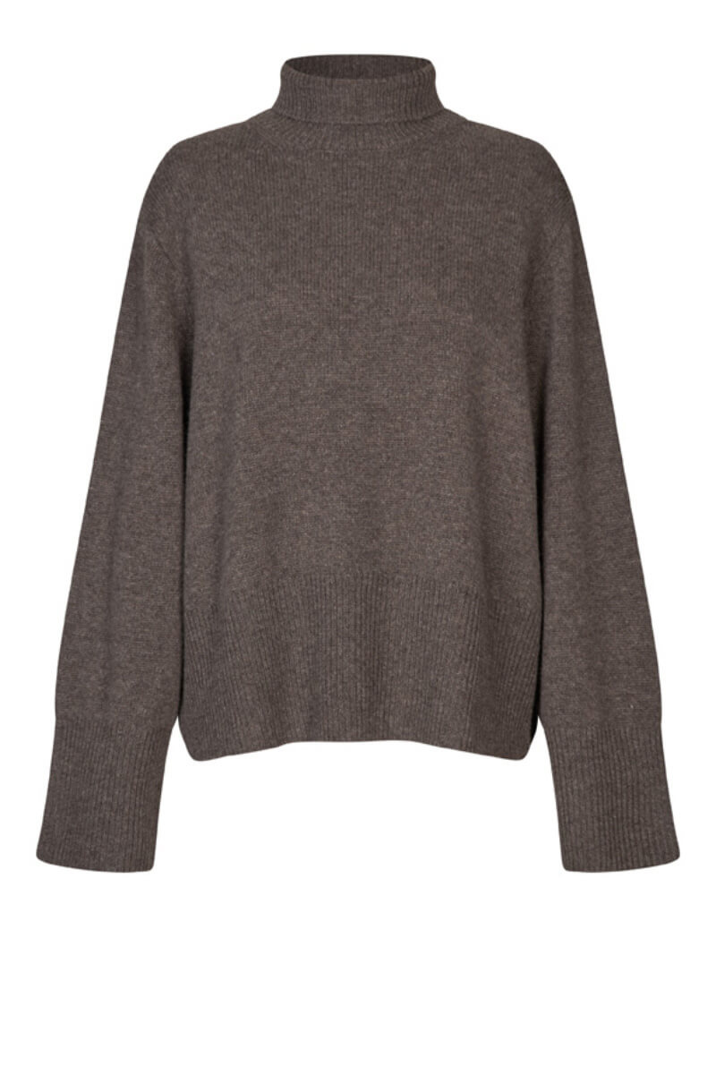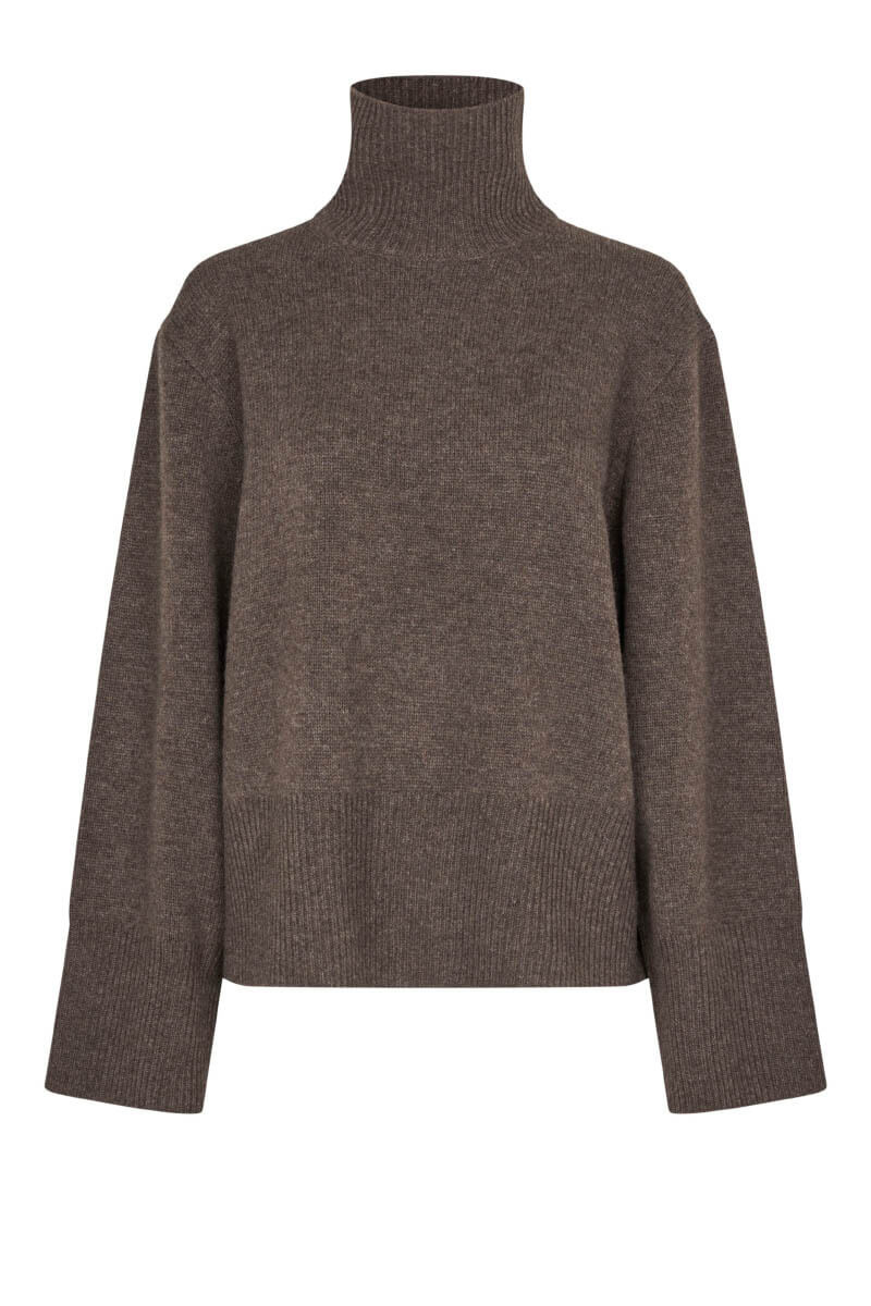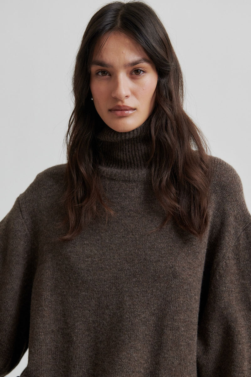 Style the brown sweater with wool trousers and loafers for a soft fall look, or with straight jeans for a casual twist. The earthy tone adds warmth and depth, while the loose fit creates a chic, comfortable feel.Knitted sweater in wool with loose fit, turtleneck, falling shoulder seams and ribbknitted edges from Second Female.