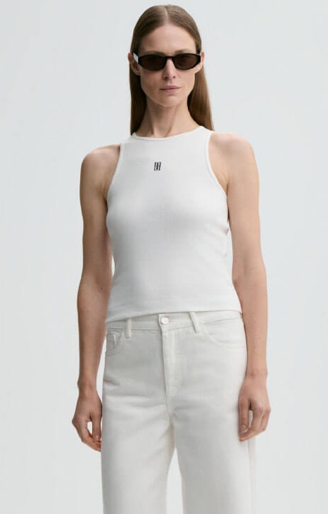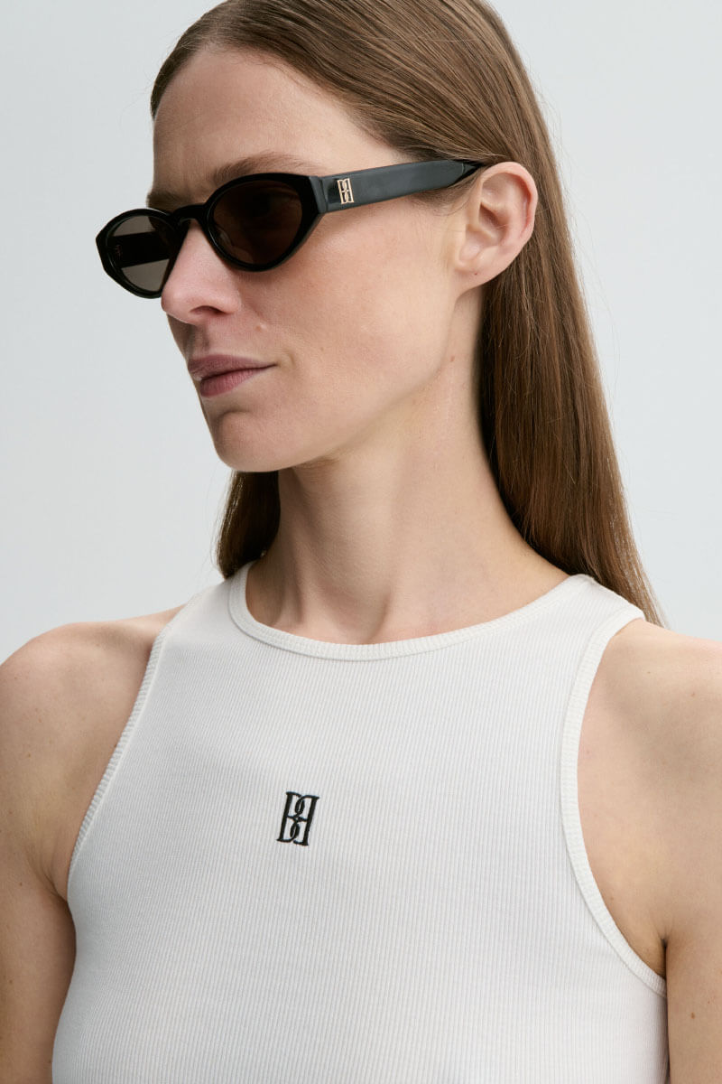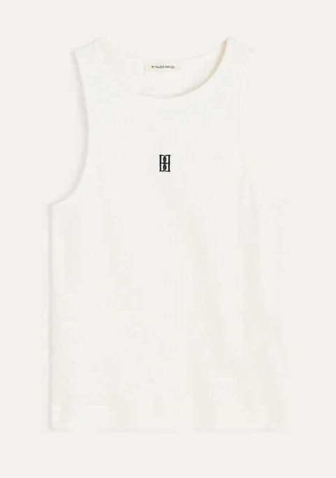 Amanias top made in organic cotton, the minimalist silhouette and stretchy fabrication make it both easy to wear and to style. Its key feature? The embroidered monogram on its front.