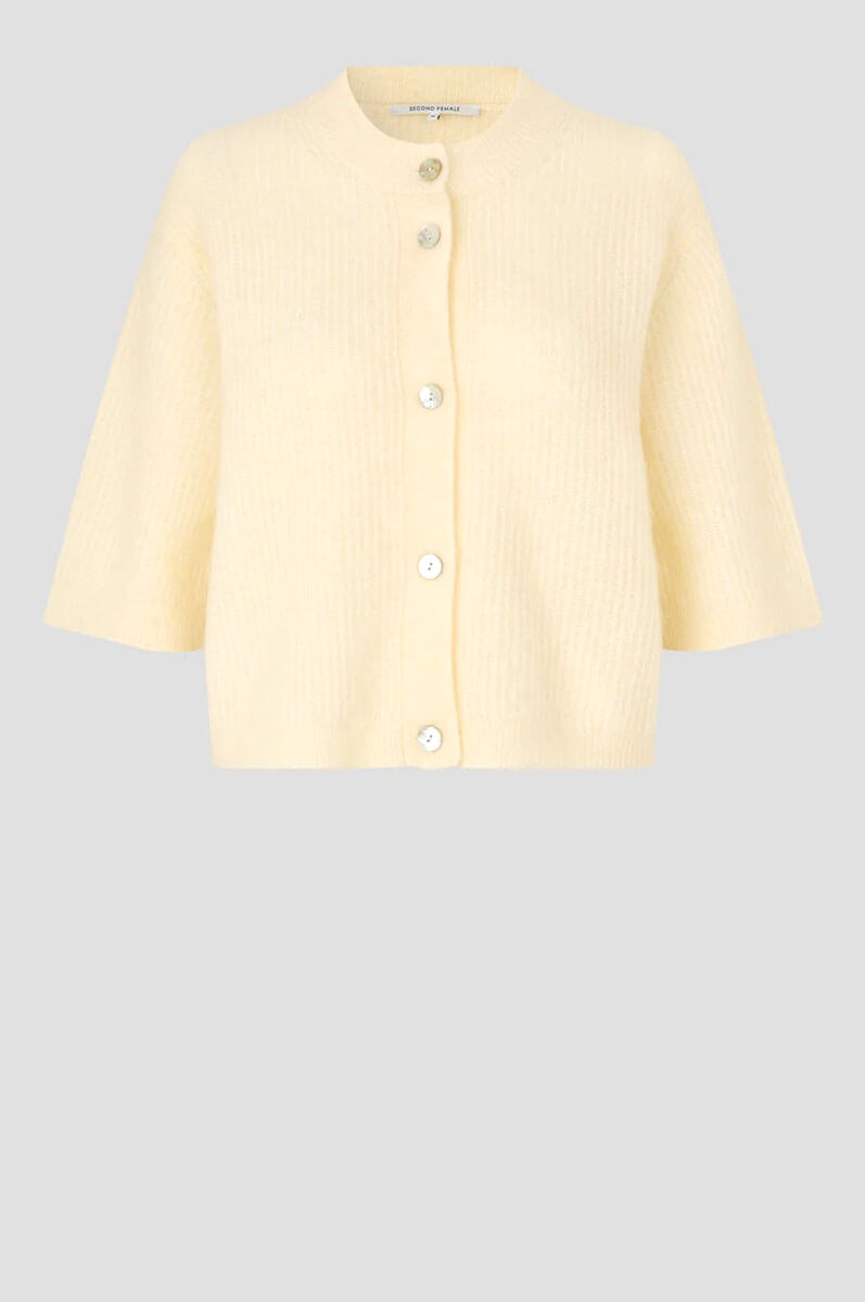 Meet the cardigan that makes every day a little softer. Knitted in a luxurious blend, with a perfect boxy fit and button detailing. Just as stylish with jeans as over a dress. A new favorite you'll never want to take off.Cardigan in a fluffy moahir blend with round neckline, short sleeves, ribbknitted edges, relaxed fit and falling shoulder seams from Second Female.