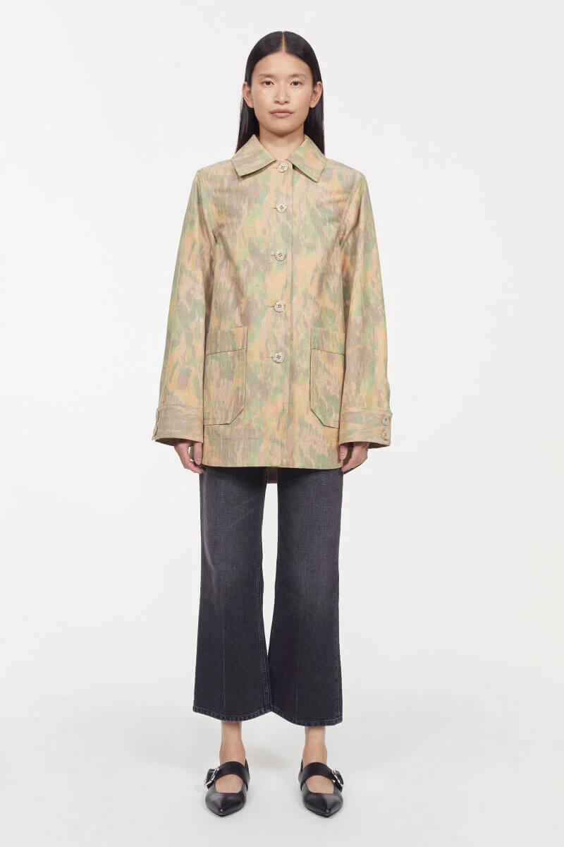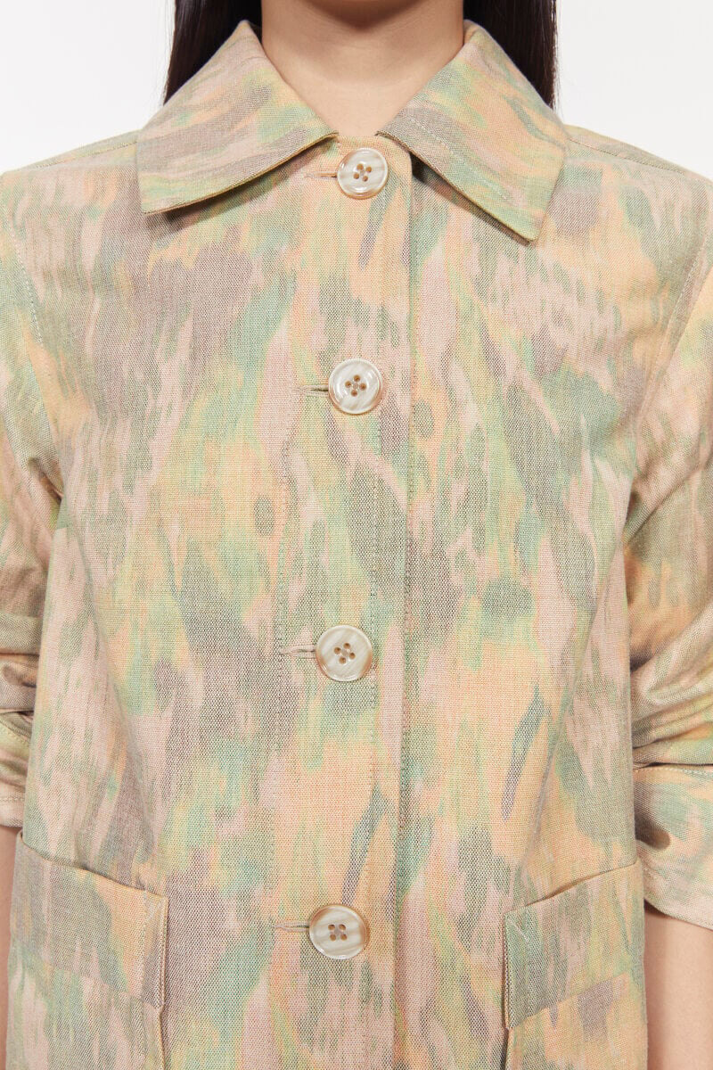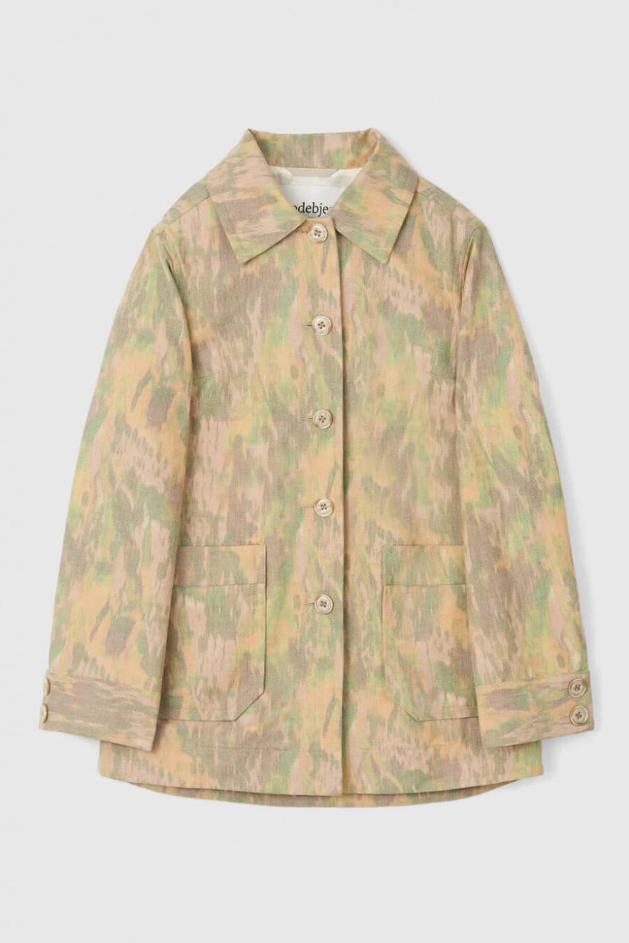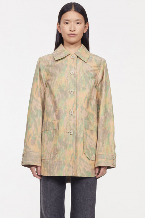 Fantastic loose fit jacket with painted printed pattern, long sleeves, sewn pockets and front button fastening from Rodebjer.- 52% Recycled Cotton, 25% Recycled Polyester, 18% Polyurethane, 5% Other Fibers