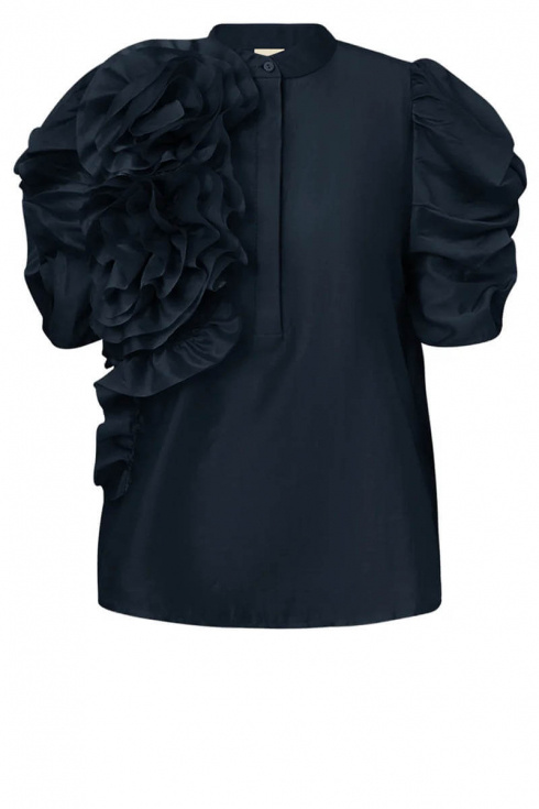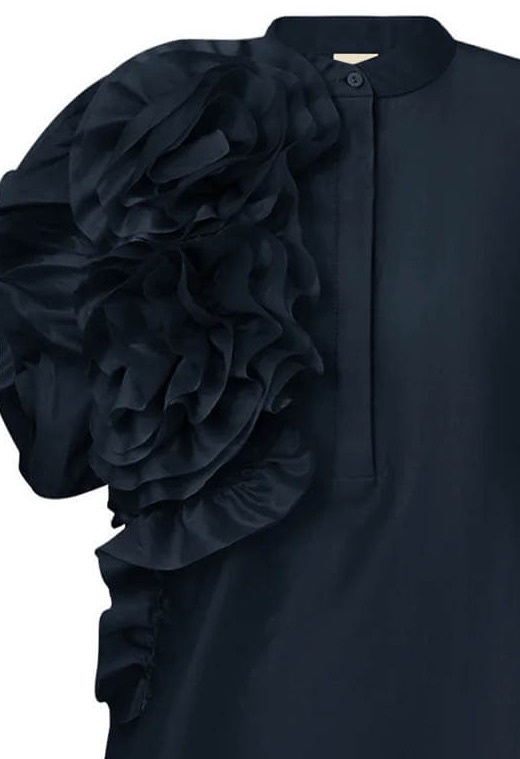 The sleeves are voluminous, contributing to a stylish look. The blouse features a high neck that closes with a button in the front, along with a highly decorative flower on one side.