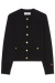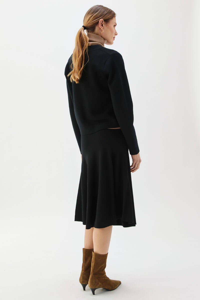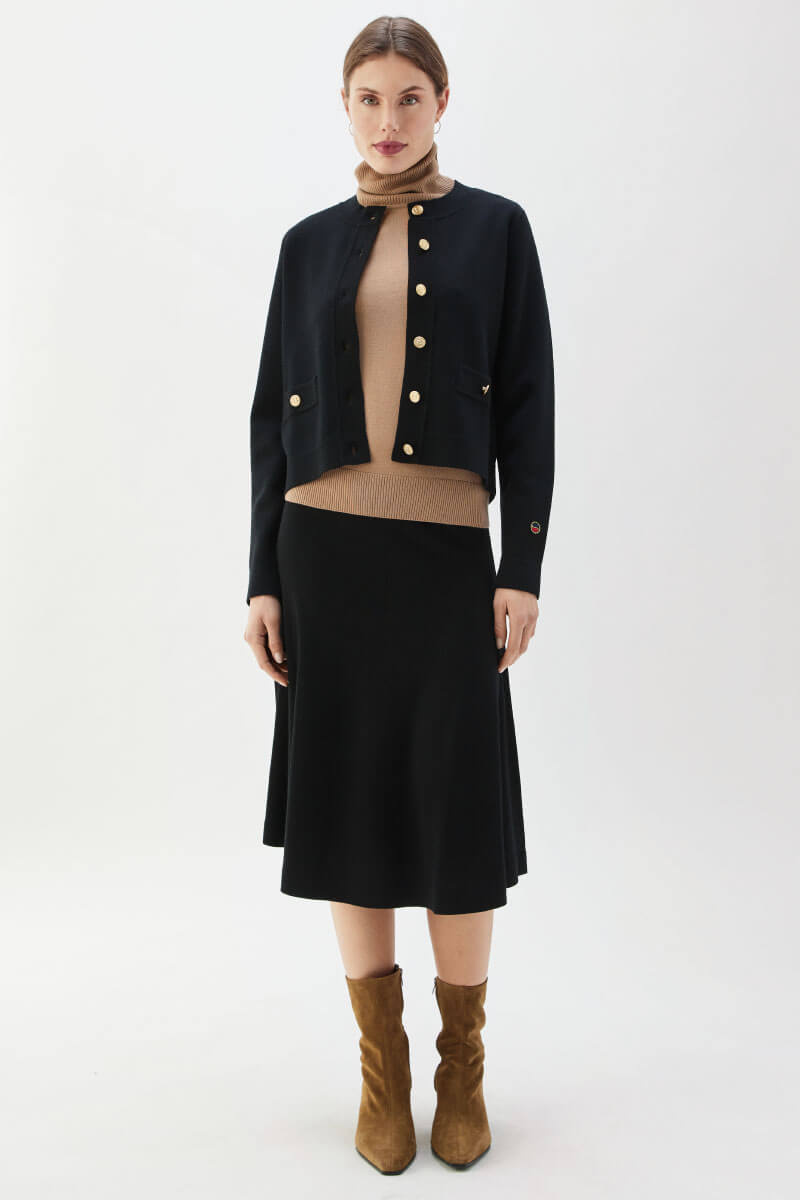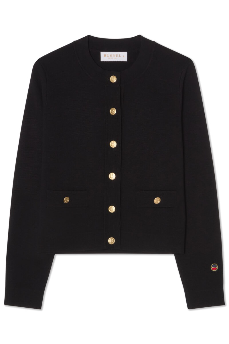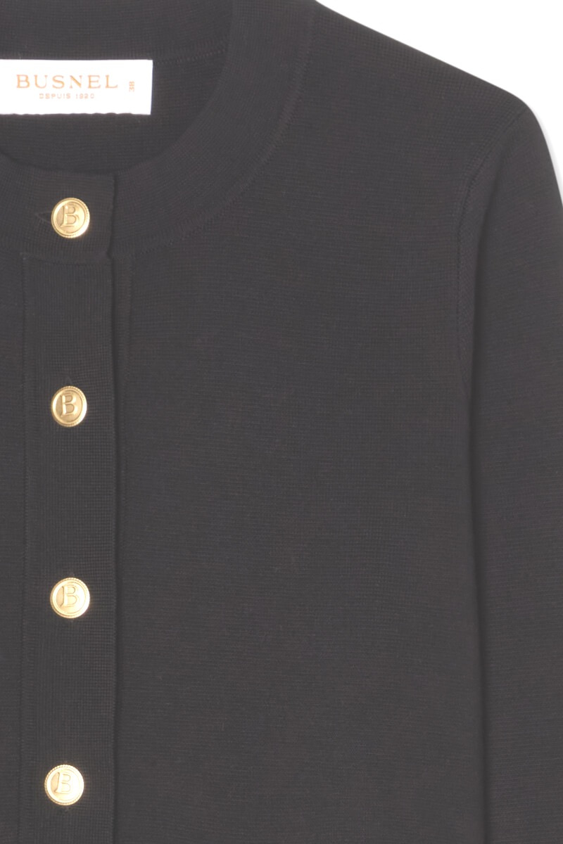 This black cardigan in soft merino wool with gold buttons is the definition of understated luxury. Wear it buttoned up with black trousers for a minimalist look or over a silk dress for a sophisticated contrast - a timeless knit design that always feels modern.Knitted cardigan in merino wool with round neckline, decorative pockets front, closes with gold colored edges front and small embroidered logo at the end of sleeve from Busnel.