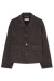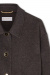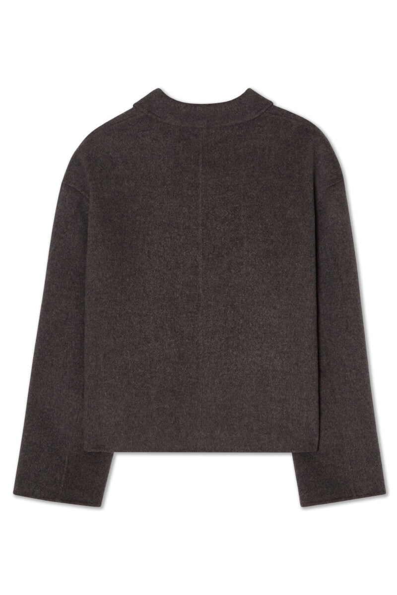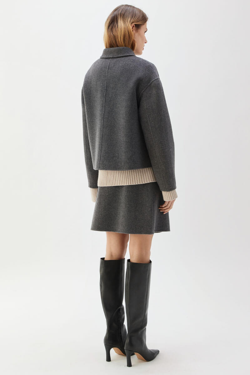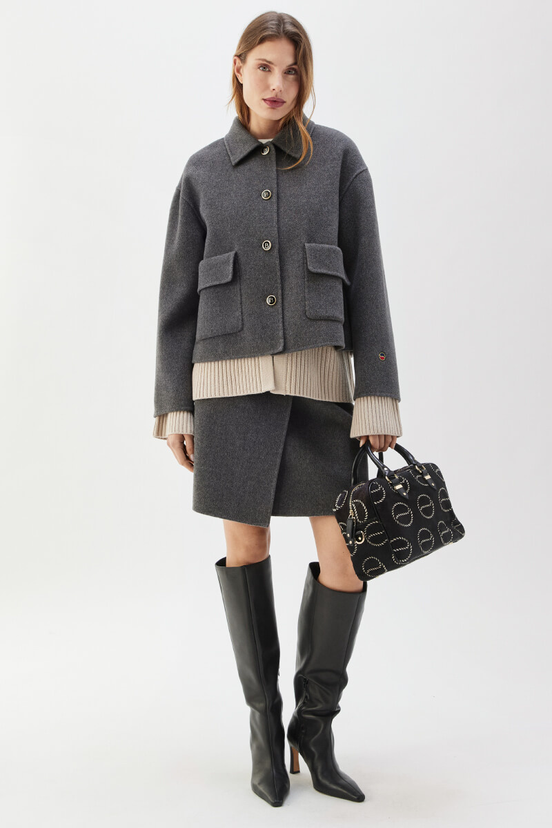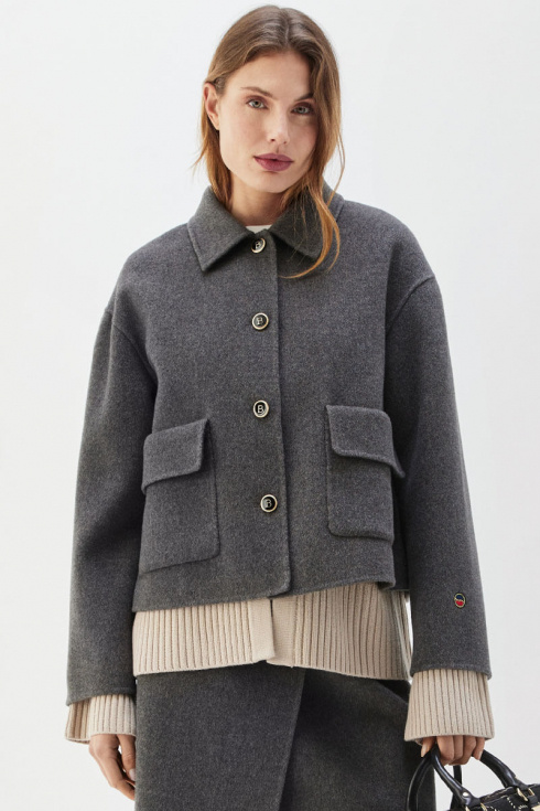 Dark grey double faced jacket designed for style and comfort. Combine with a knitted polo, straight jeans and boots for a modern everyday look. Equally natural over suit trousers or with an elegant midi skirt.Double faced jacket in wool with loose fit, pockets front, collar, falling shoulder seams, closes with buttons and embroidered logo at the end of sleeve from Busnel.