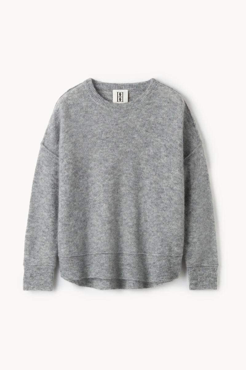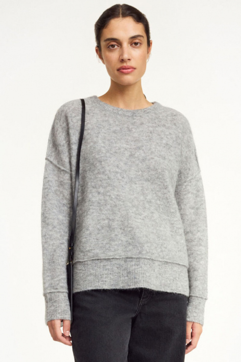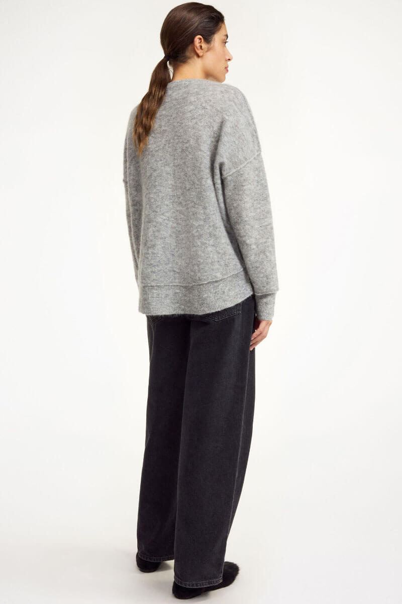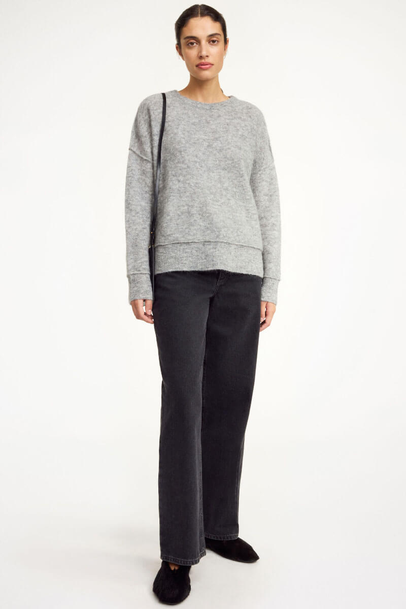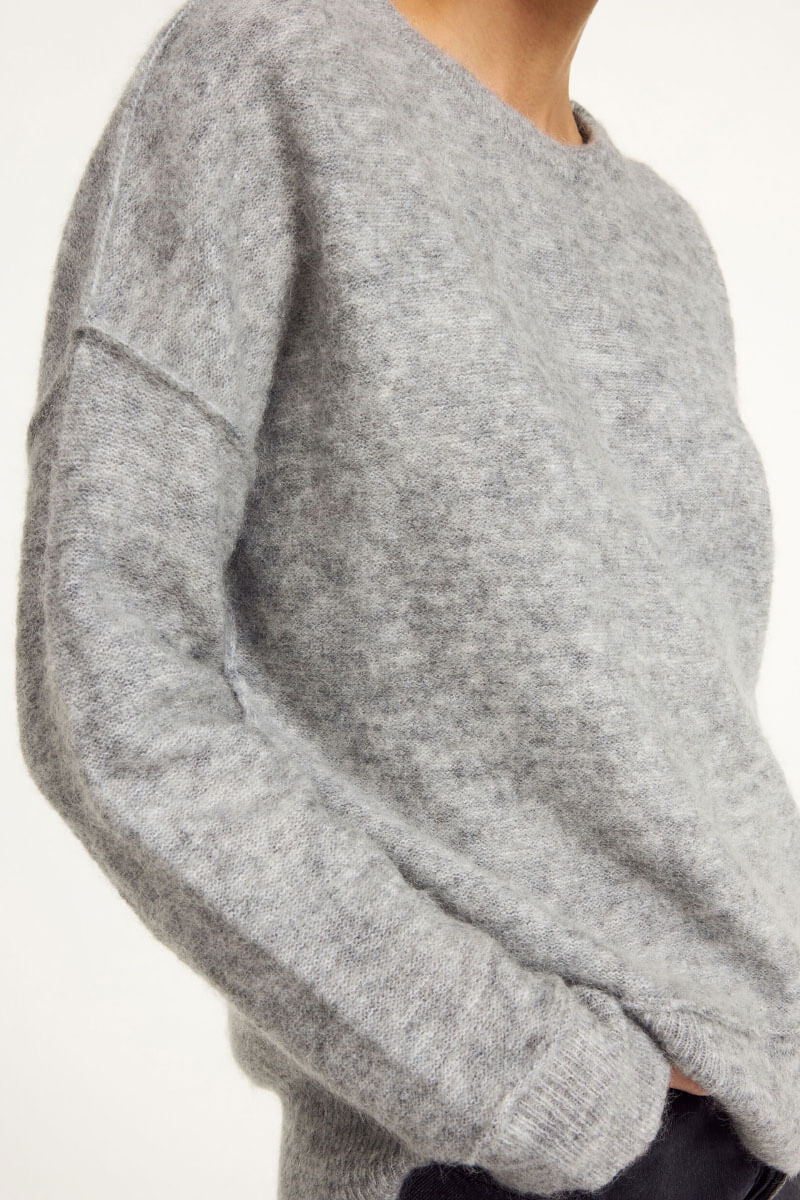 Grey wool sweater in an oversized fit and soft fluffy wool – just as perfect over suit trousers as with a silk skirt and loafers. A shade that balances color, shape and function with obvious style. Minimalism, but never without presence.Knitted sweater in a fluffy mohair blend with a round neckline, dropped shoulder seams, oversized fit and ribbed edges from By Malene Birger.