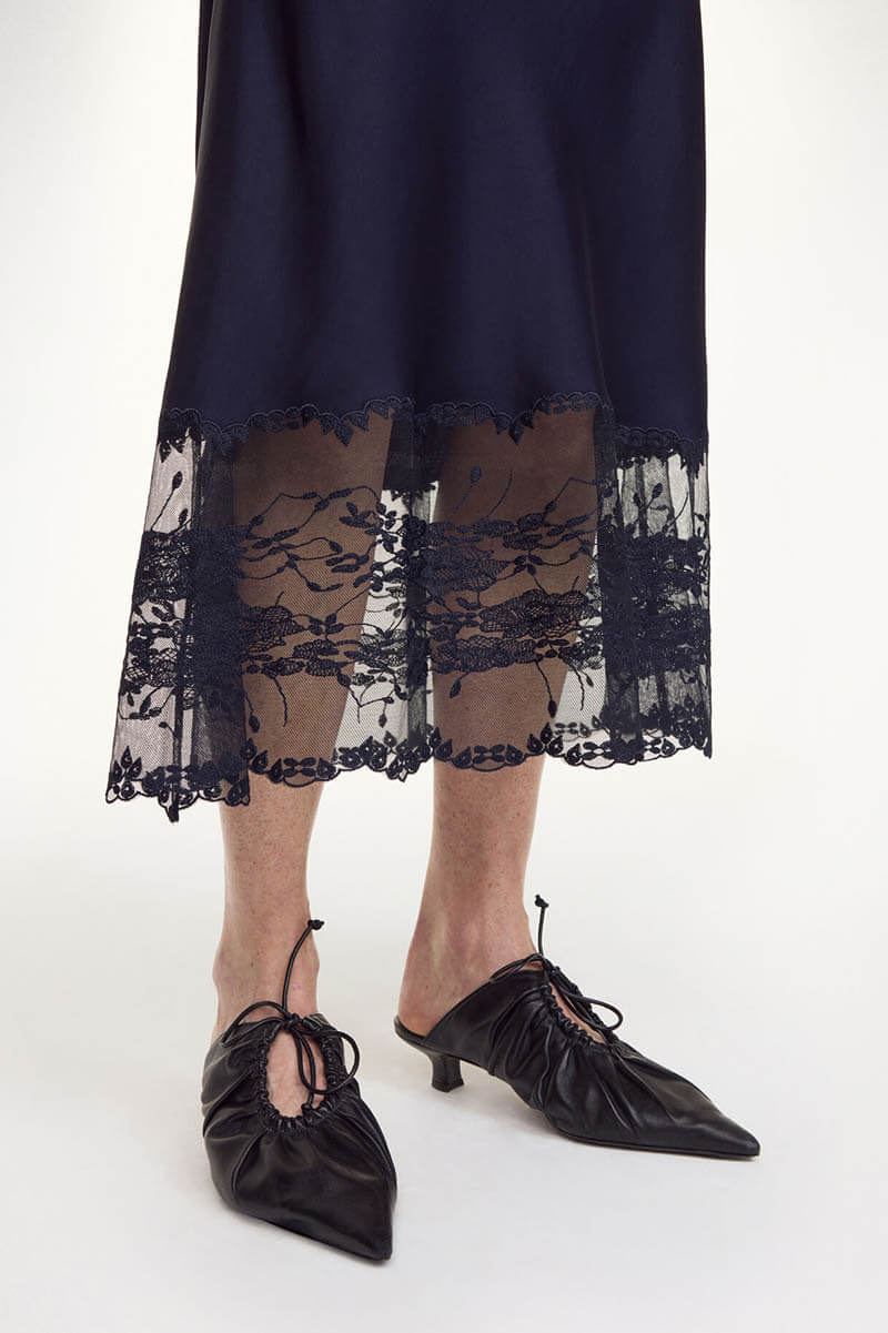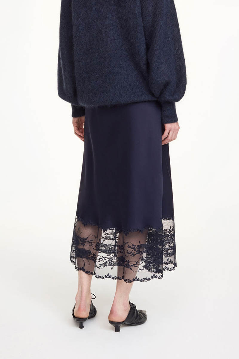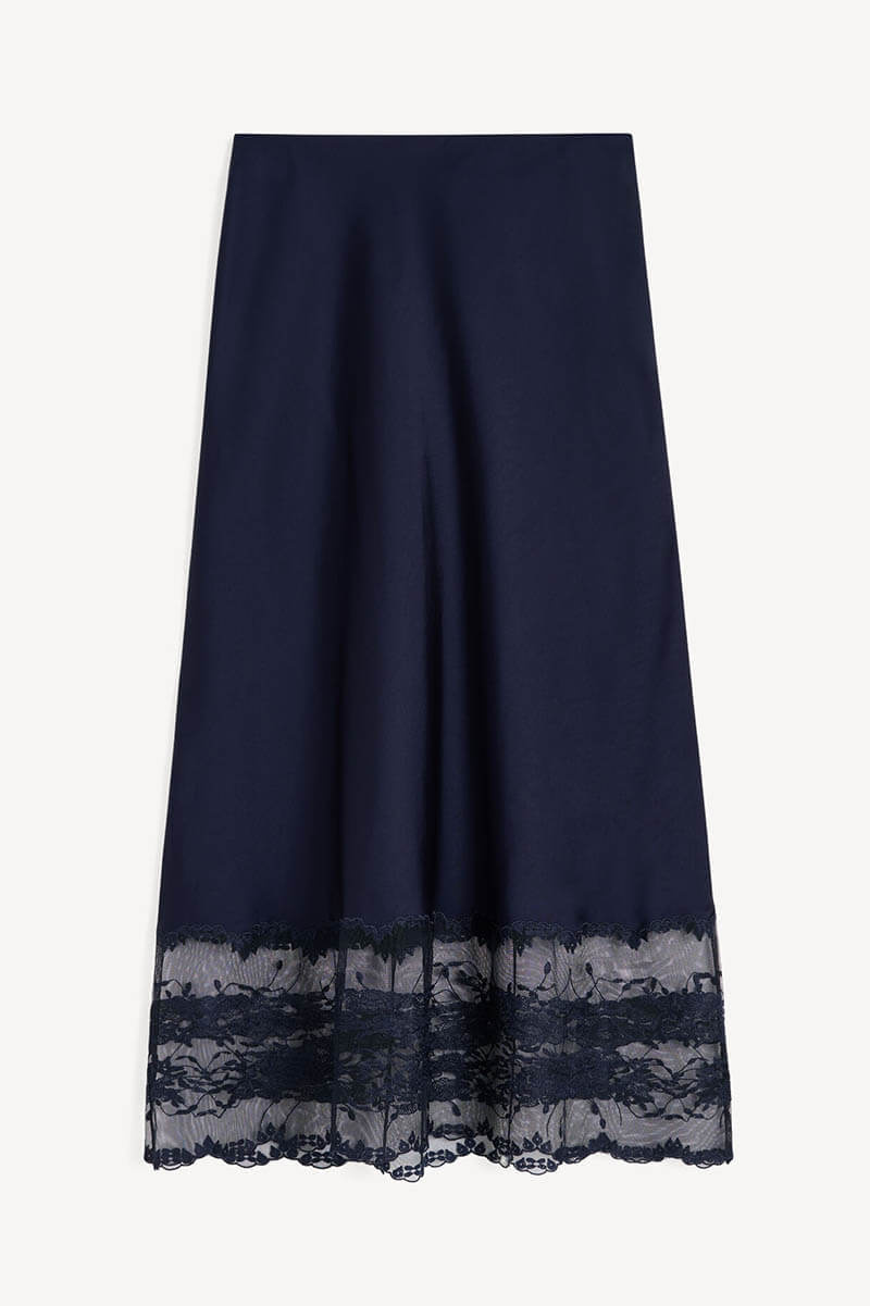 Modern bohemiastyle to your year-round wardrobe with the Blake skirt. The maxi design is made in satin and decorated with a delicate lace at its bottom. Equally wearable for festive occasions with the Leeba top or workdays with a casual sweater, it will be a favourite for seasons – and years – to come.