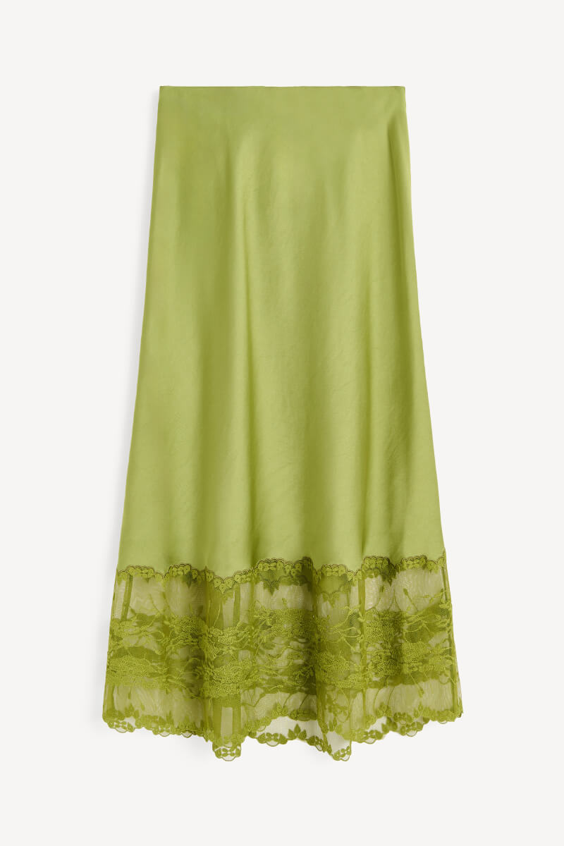 A satin skirt in acid green with a tone-on-tone lace trim at the bottom – where shiny elegance meets feminine edge. Equally nice with a simple t-shirt or a matching tank top.A-shaped skirt in satin with elastic waistband, lace trim at the bottom and regular fit from By Malene Birger.