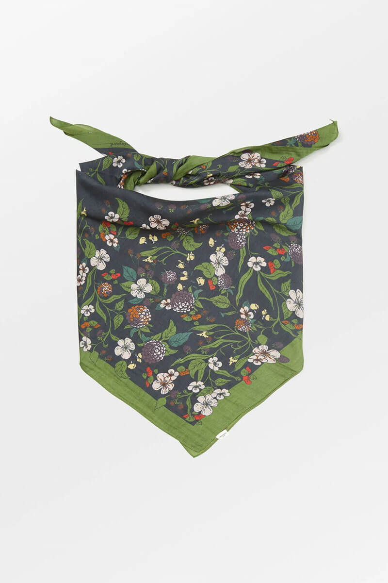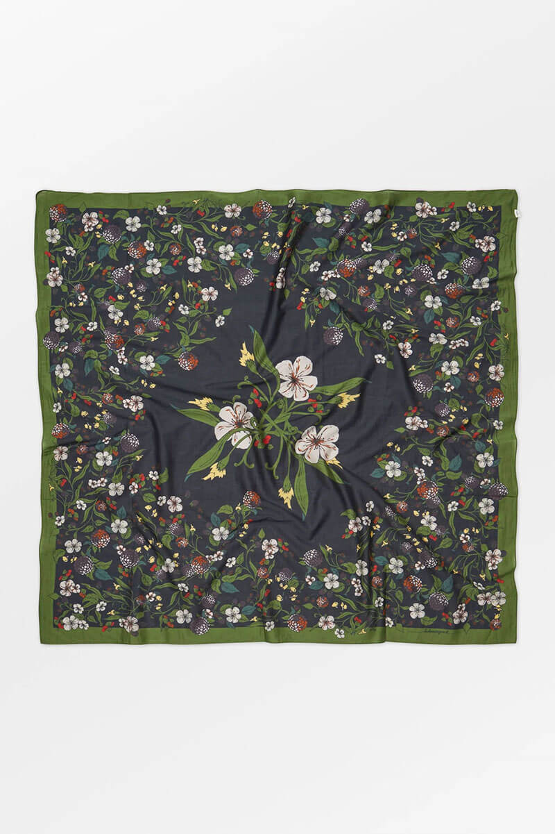 The Bromflora Sico Scarf, designed by BeckSöndergaard,is a charming scarf measuring 110 x 110 cm, made from 80% cotton and 20% silk. Featuring a lively floral and berry pattern with striped edges, its elegant design adds a sophisticated touch to any outfit.