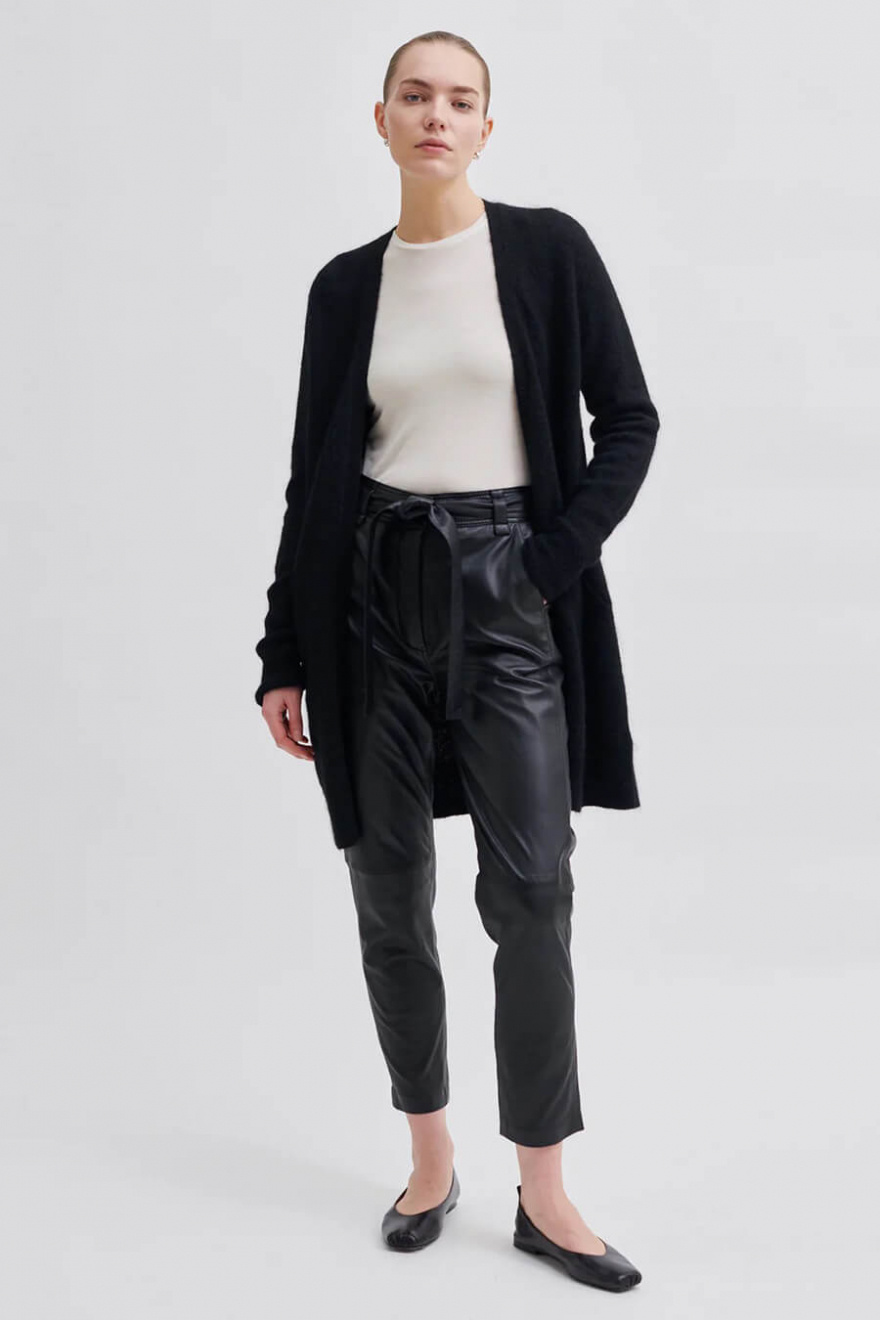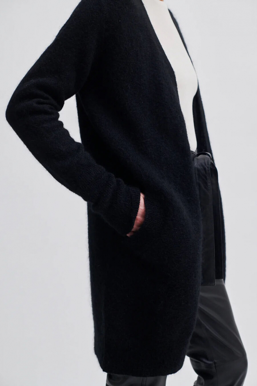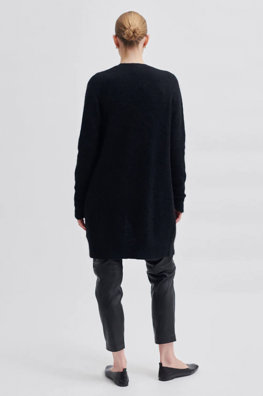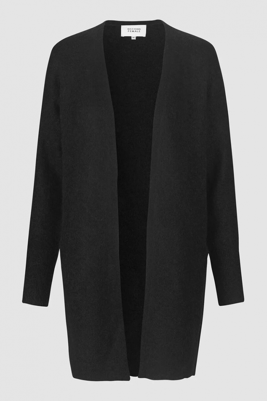 Let's talk about the black open knit cardigan in luxurious mohair blend - a garment that feels like a warm hug. Perfect to throw over any outfit, with its dreamy texture and relaxed fit. Combine with jeans or a dress for that nice, nonchalant style that's always on point.Knitted open cardigan in a mohair blend with loose fit, pockets front and ribbknitted edges from Second Female.
