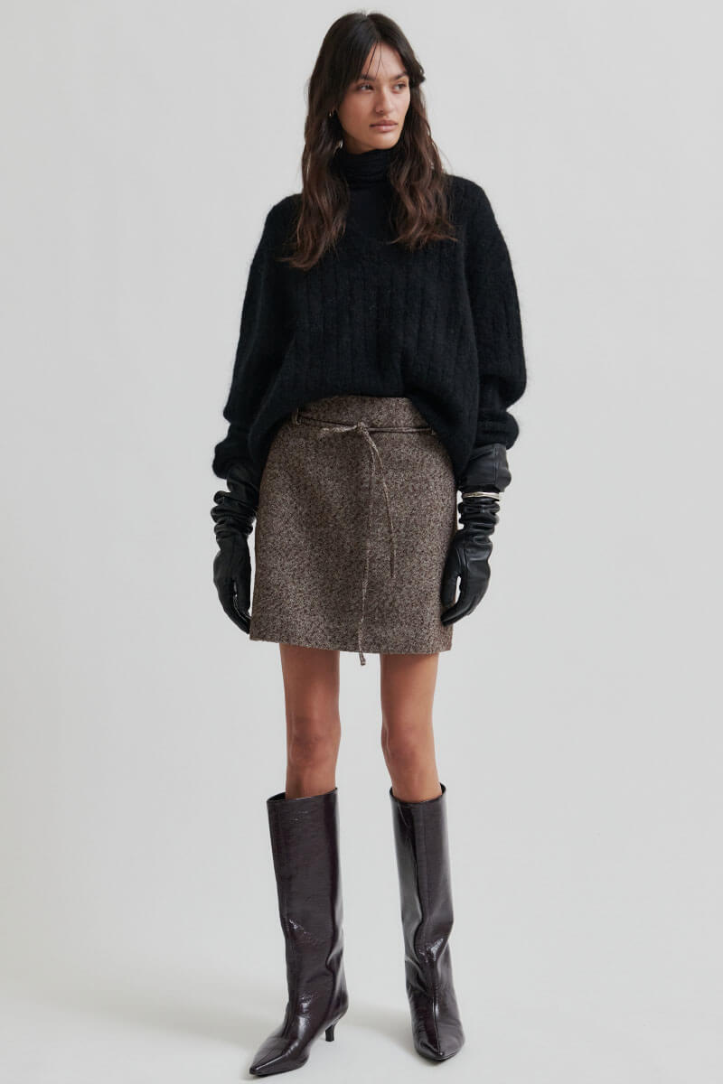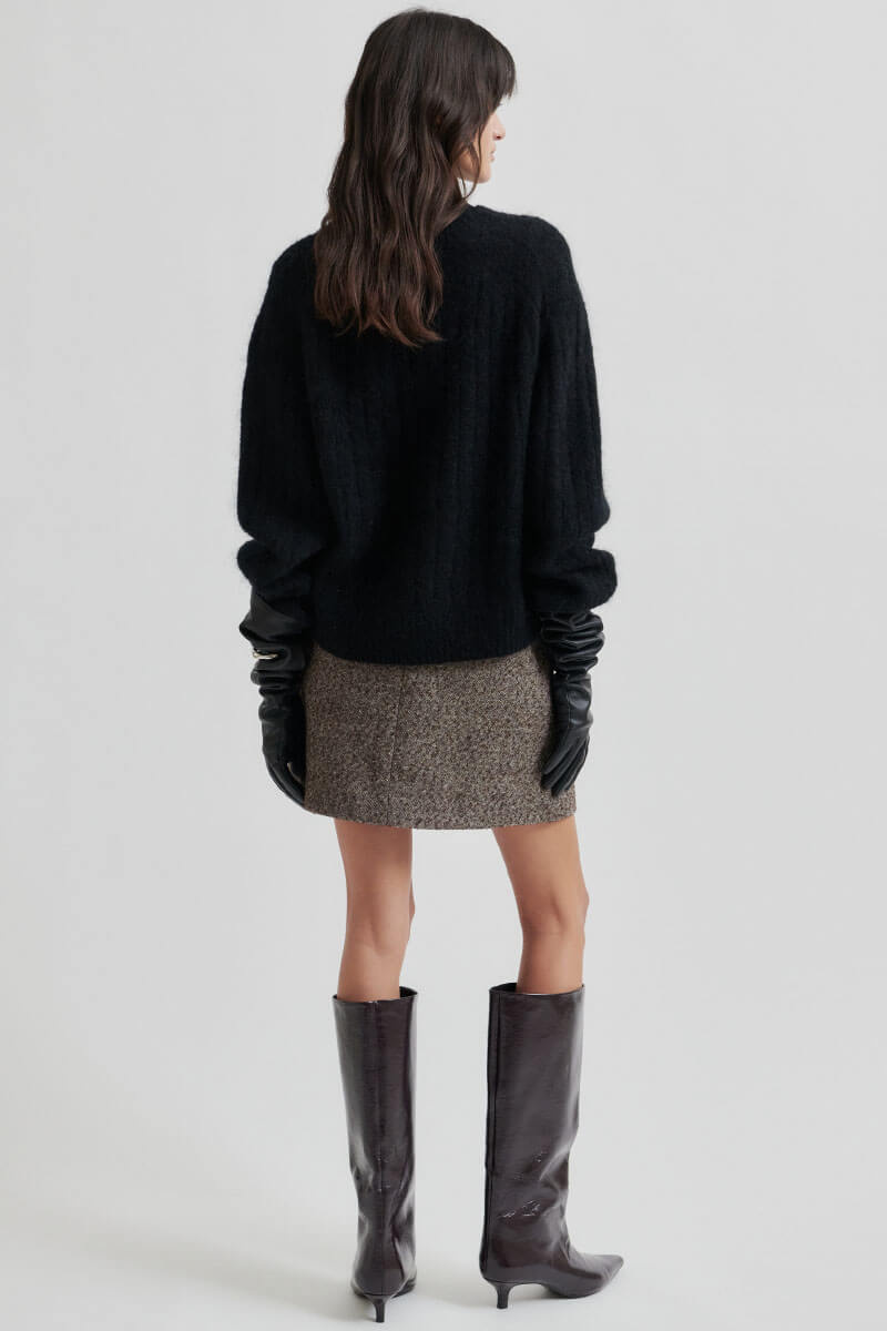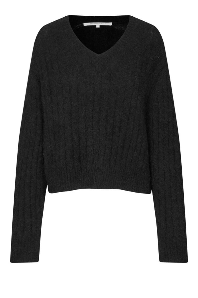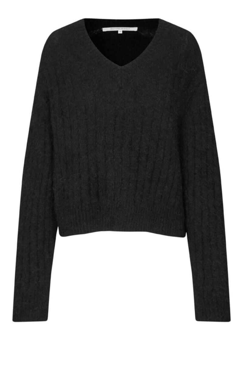 A relaxed fit, black ribbed sweater that exudes a cool, minimalist energy. Pair with dark denim and loafers for a stylish everyday look, or with a satin skirt and jewelry for an evening look that feels both soft and confident.Ribbed sweater in a fluffy mohair blend with a v-neck, loose fit, dropped shoulder seams and ribbed cuffs from Second Female.