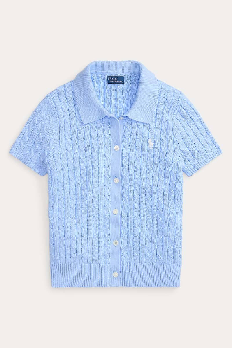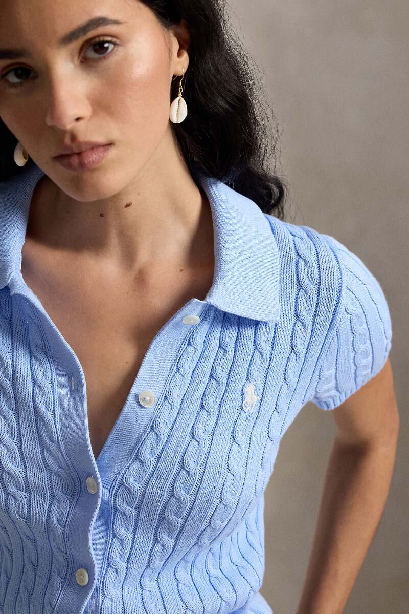 Cable cotton short-sleeve polo cardigan, Baby blue