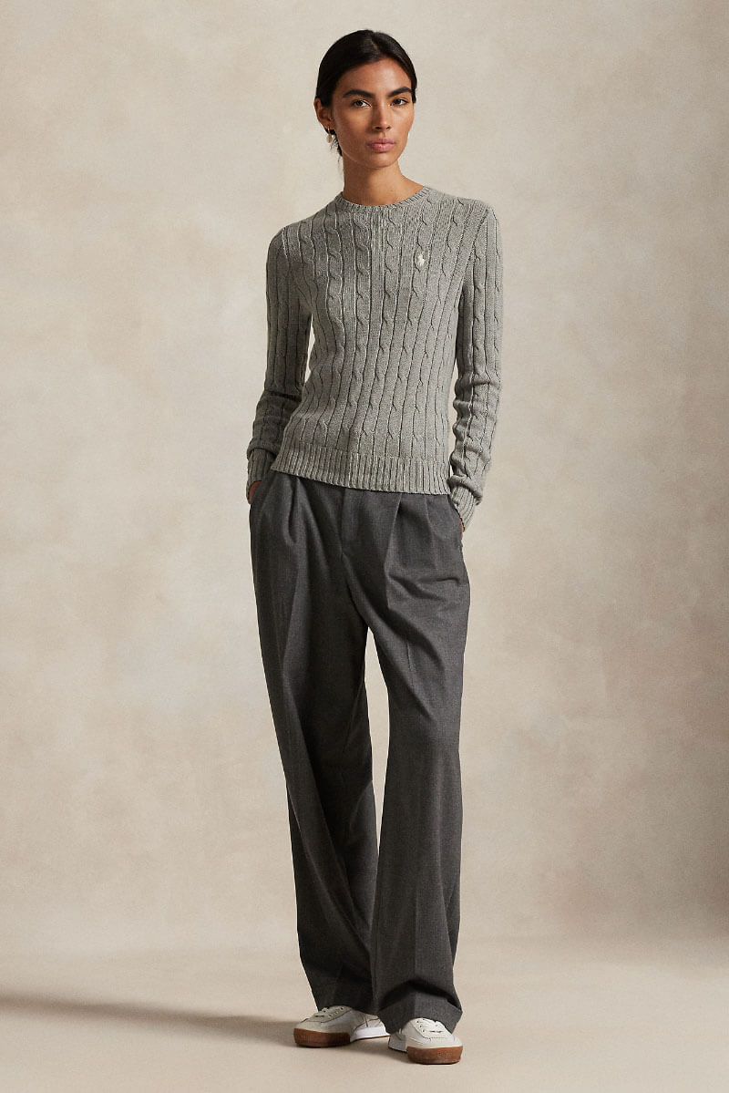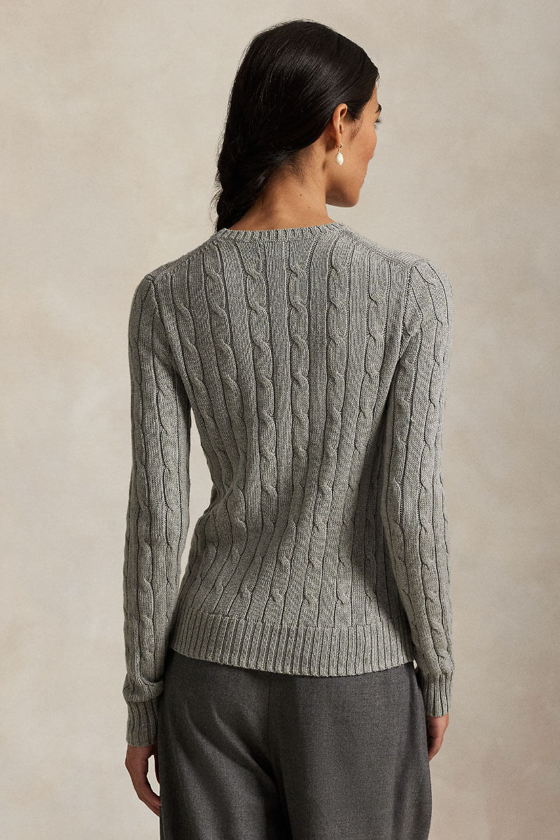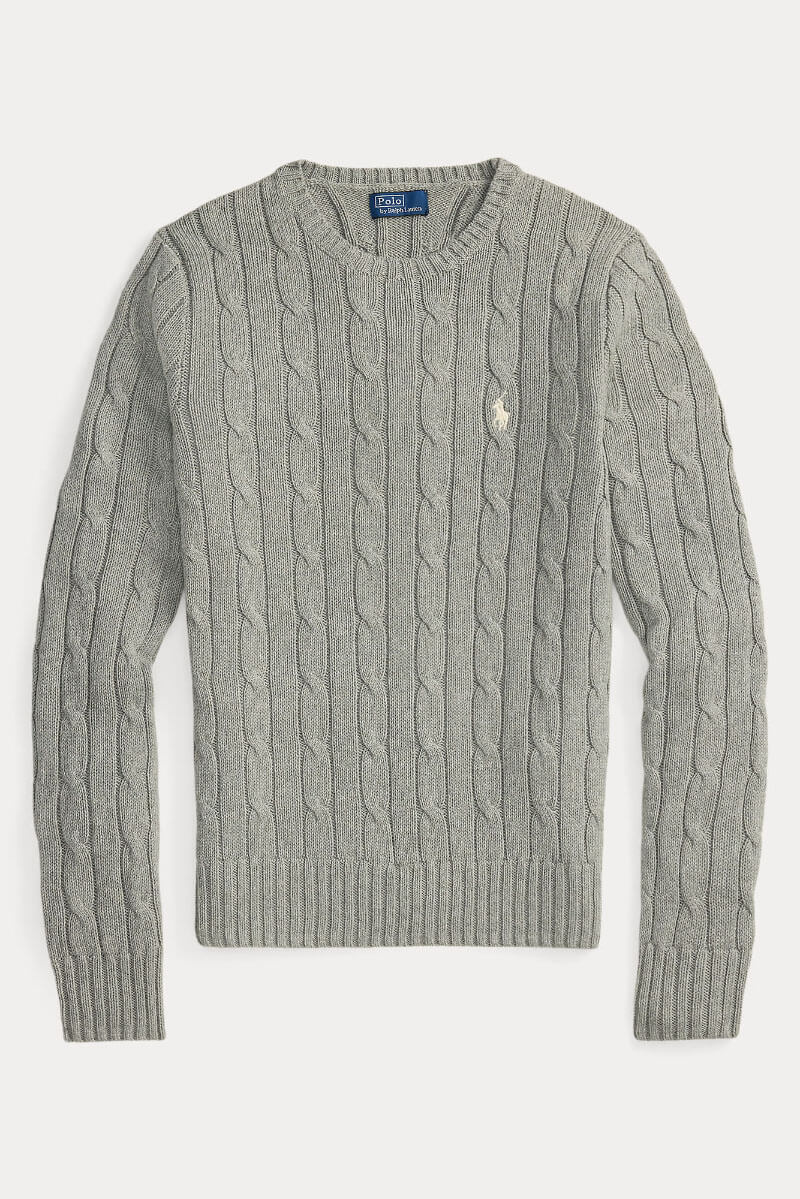 A grey cable knit sweater in soft cotton is the definition of luxury. Wear it over a white shirt with straight jeans and loafers, or combine with a silk skirt and coat for a look that is both casual and sophisticatedly elegant.Cable-knit top in cotton with a slim fit, round neckline, embroidered logo on the front and ribbed edges from Polo Ralph Lauren.