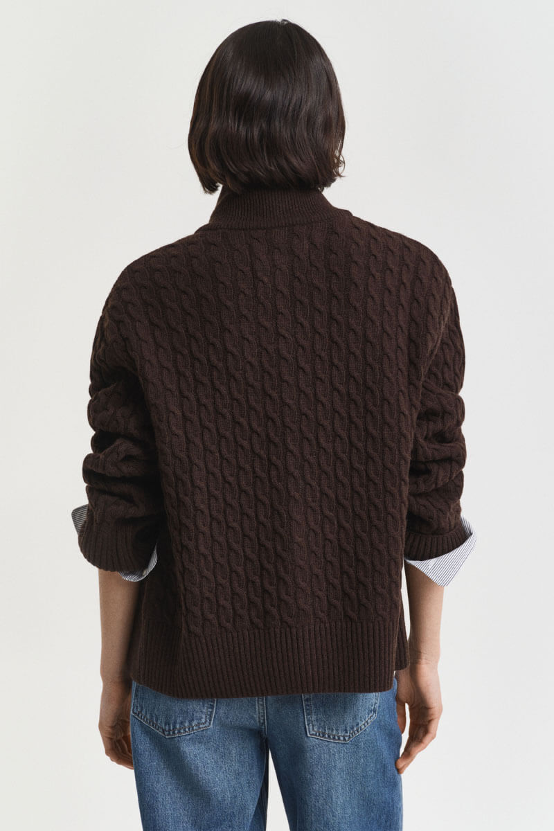 The sweater features a high collar, an all-over cable-knit pattern on the body and sleeves, and 2x2 ribbed trims. It is knitted from a super-soft Italian blend of wool, viscose, and cashmere. Subtle Gant logo on the sleeve.