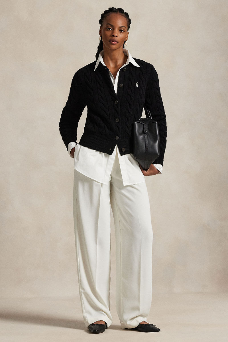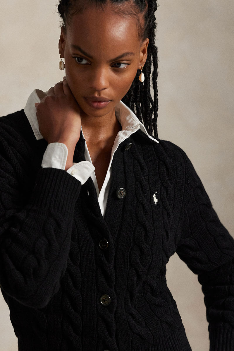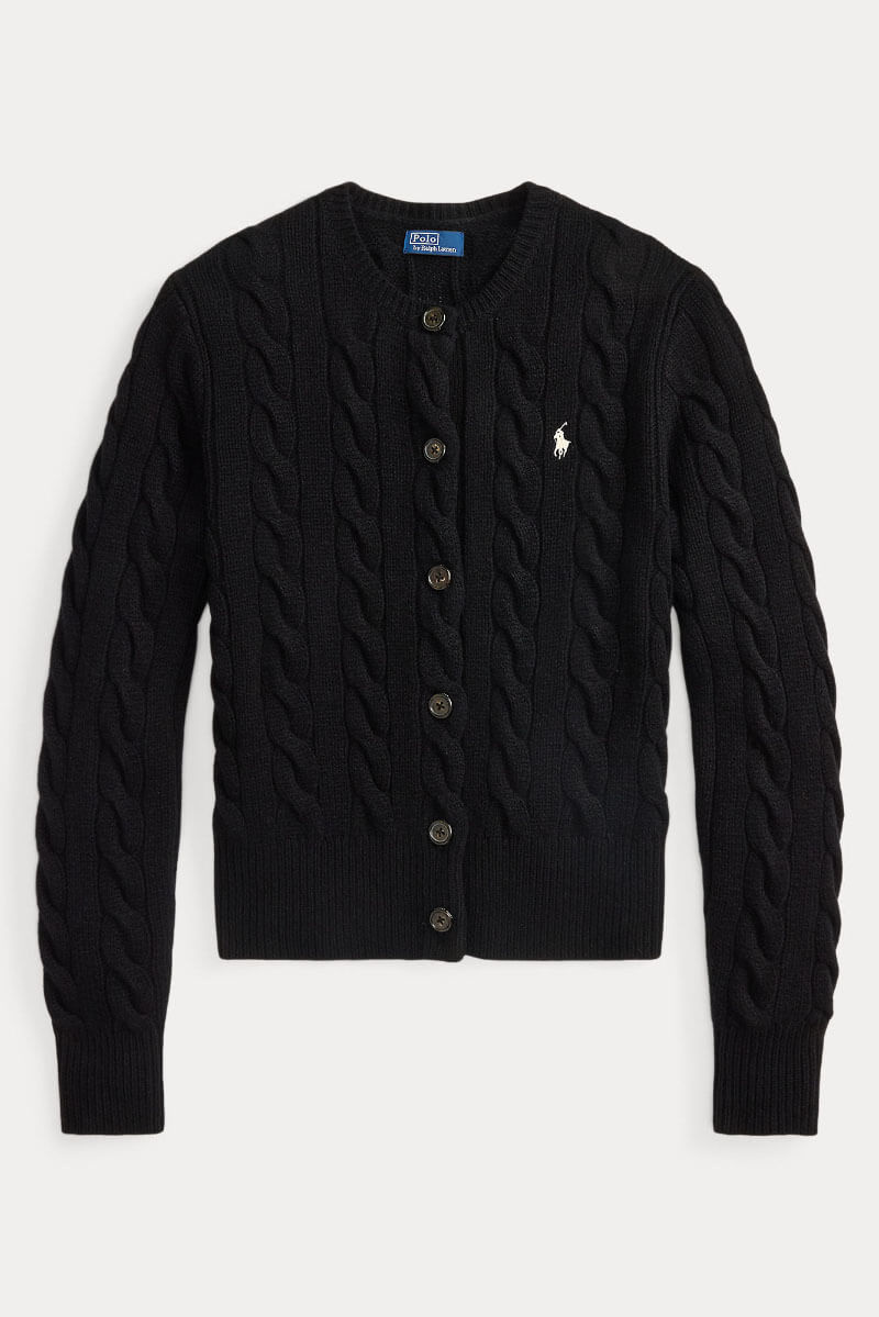 Black cable-knit cardigan in wool and cashmere – a stylish investment. Wear open over a white t-shirt and straight jeans, add jewelry and boots. The soft texture contrasts with sharp cuts and sets a casually elegant tone.Cable-knit cardigan in a wool and cashmere blend with a round neckline, slim fit, ribbed edges, button closure at the front and an embroidered logo at the front from Polo Ralph Lauren.