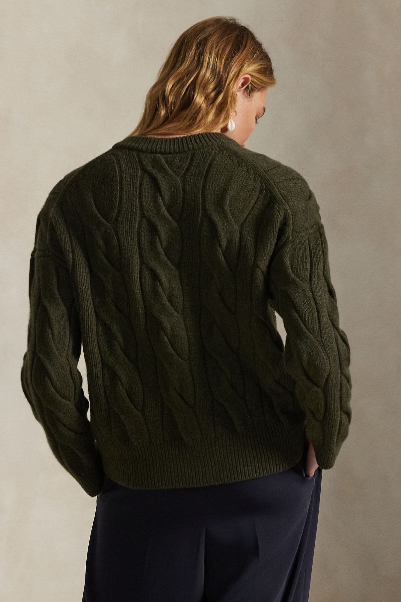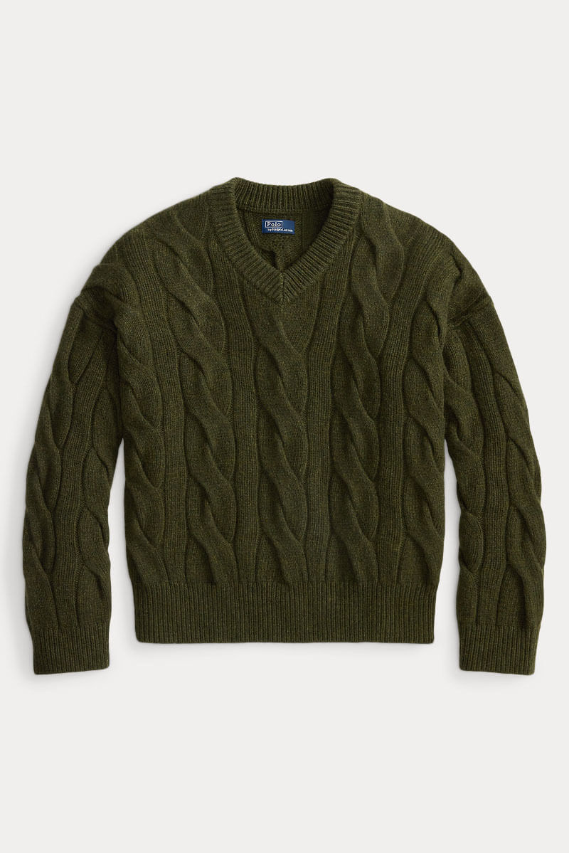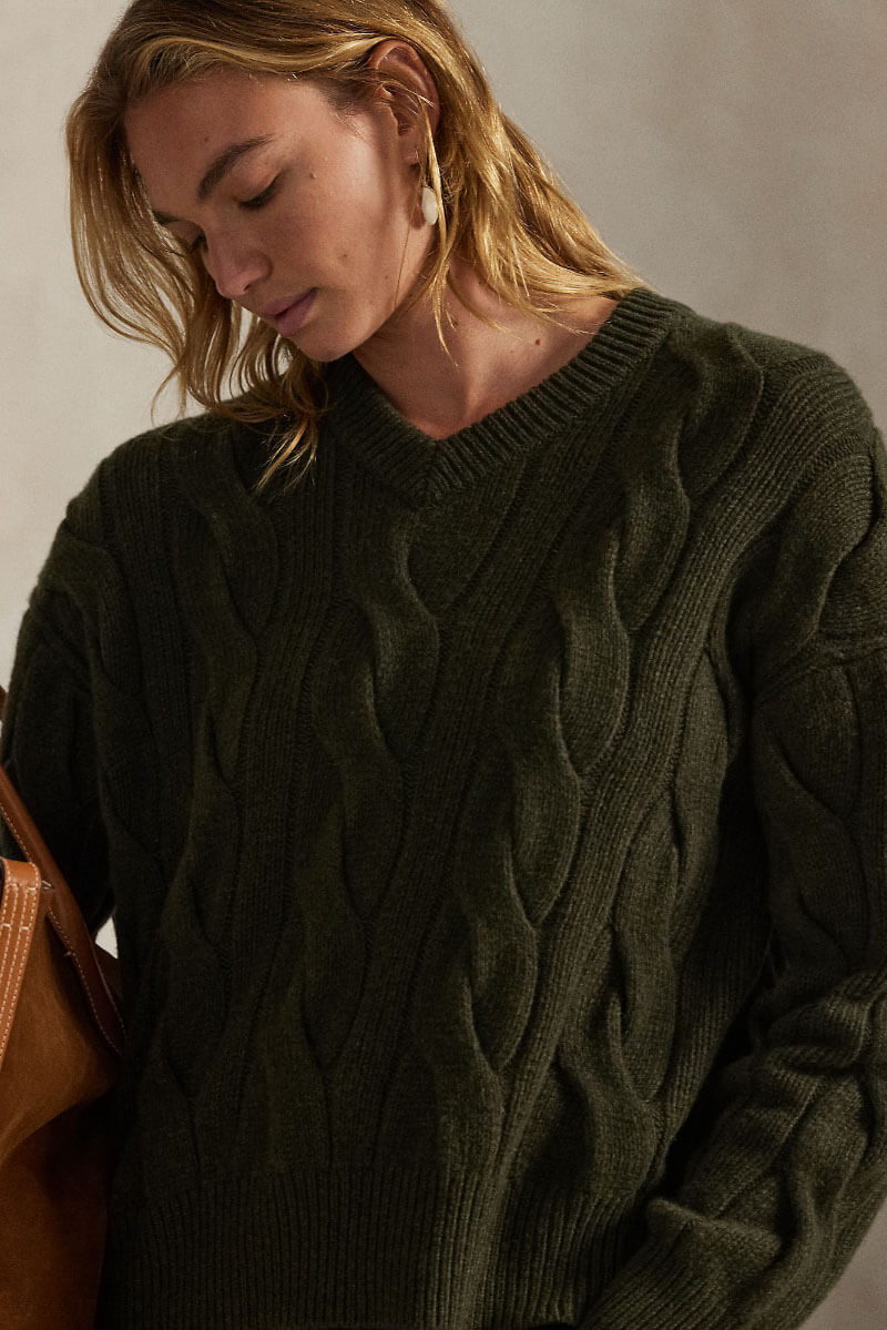 Ammodern classic in a new take. This olive-colored knitted sweater features a timeless V-neckline that adds a clean and versatile look. The larger, distinctive cable knit details create a rustic yet elegant feel, adding both texture and depth to your outfit.