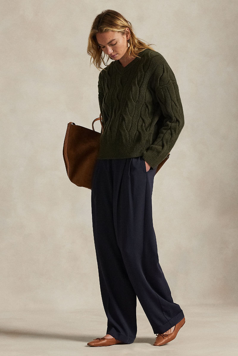 Cable-Knit Wool-Cashmere V-Neck Sweater, Olive