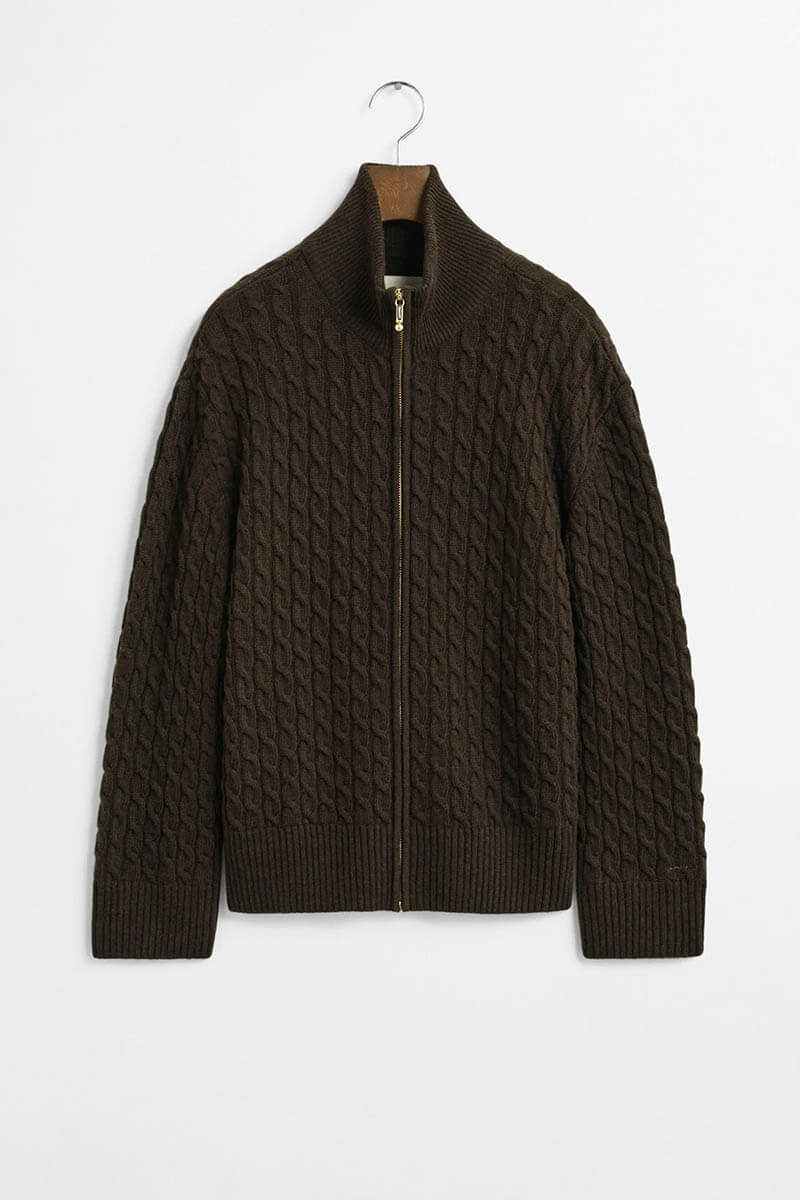 Sweater in an exclusive blend of Italian wool, viscose, and cashmere with an all-over cable knit structure from Gant. It features a double ribbed collar with a two-way zipper that extends all the way up, and clean ribbed detailing at the cuffs, neckline, and hem.