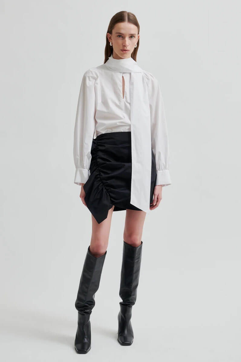 Elegant blouse from Second Female, crafted from lightweight and smooth organic cotton. Features a keyhole opening at the front with button fastening and a detachable tie detail that can be styled in multiple ways. Designed with long sleeves, straight raglan seams and buttoned cuffs. The relaxed and airy fit gives a sophisticated yet effortless look.