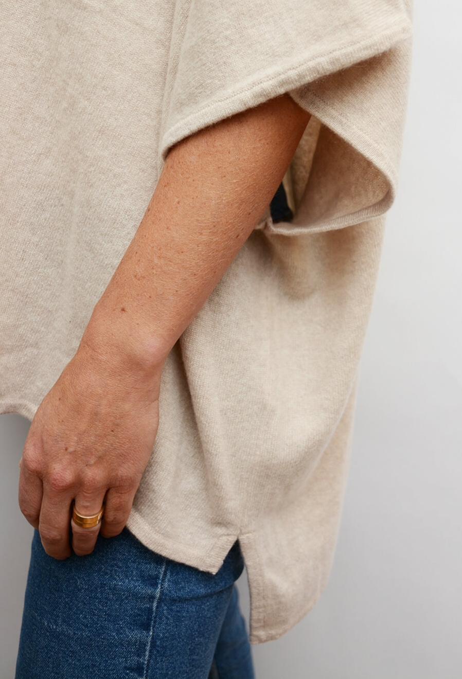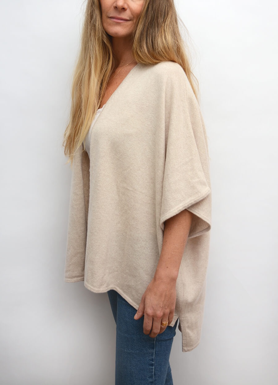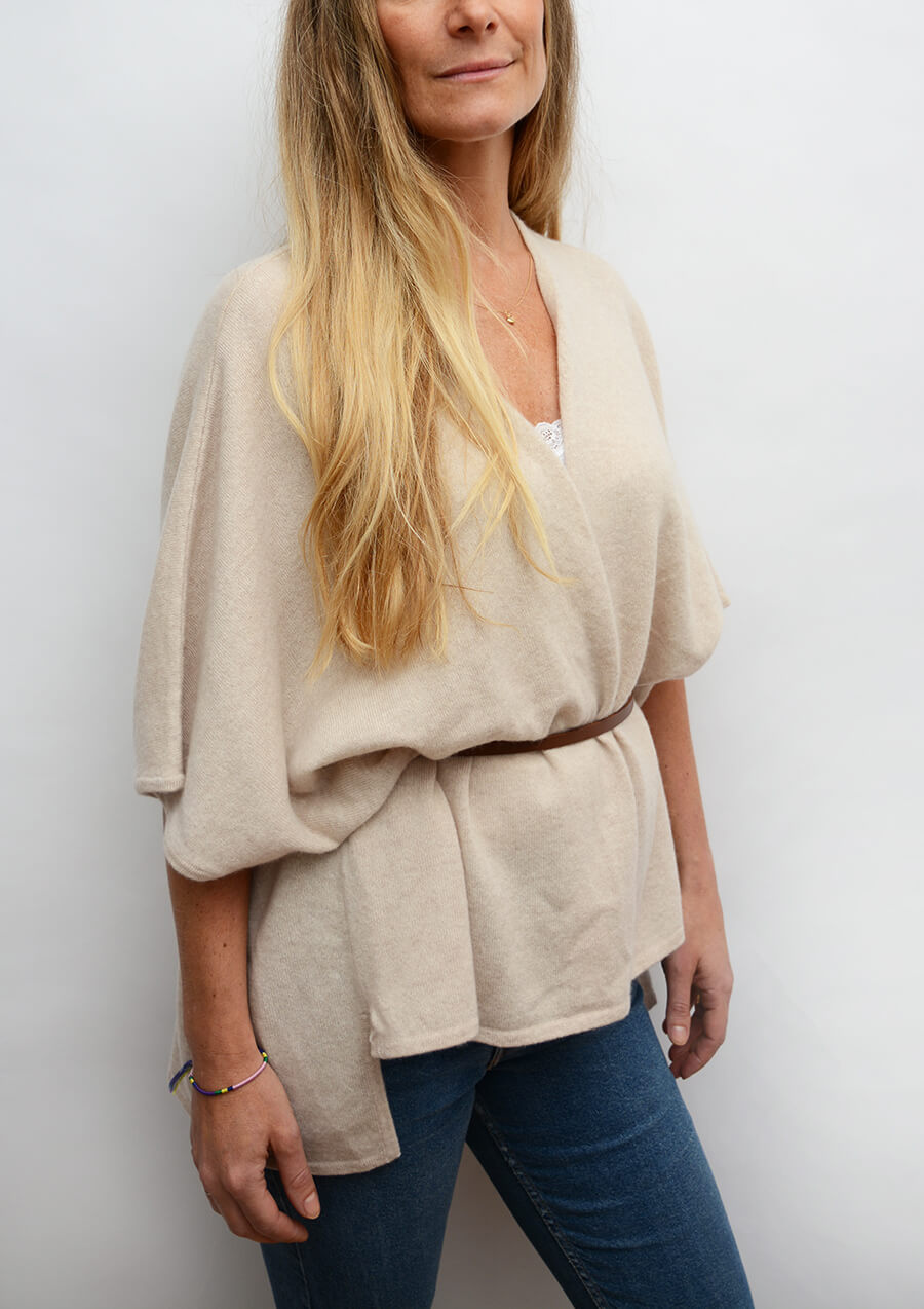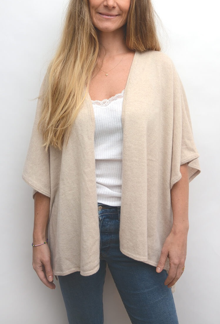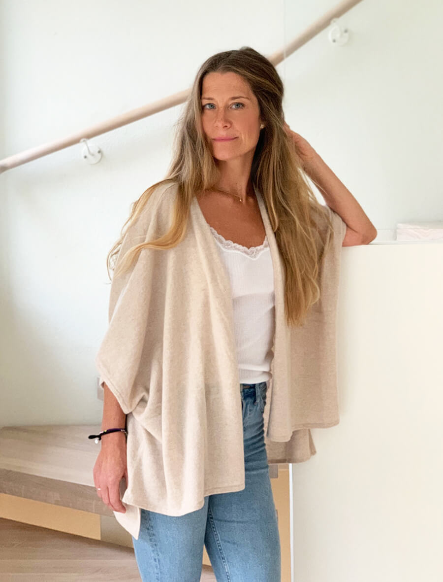 A garment you wear as a cardigan, poncho in luxurious cashmere. Open in front and longer at the back.Space in the garment. Size S/M or M/L.