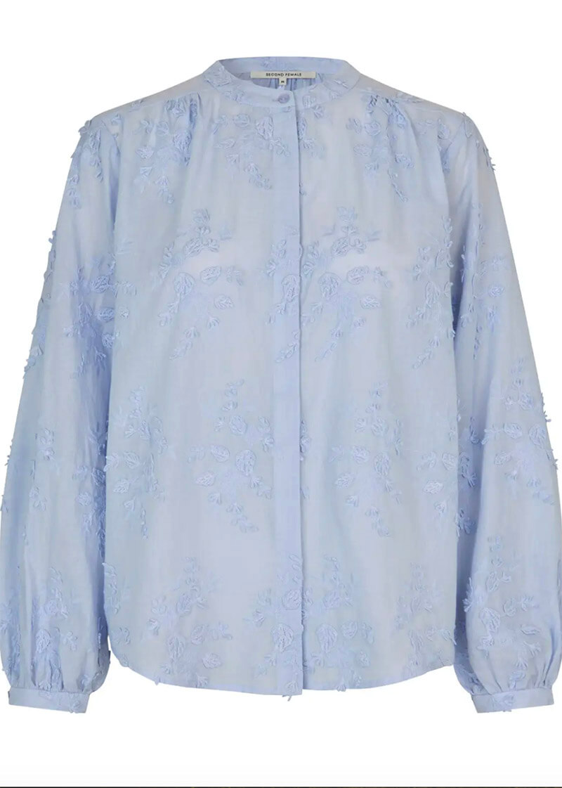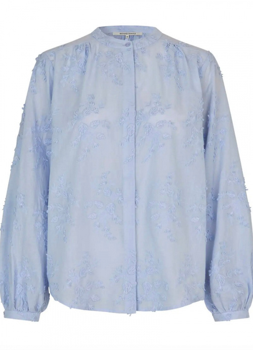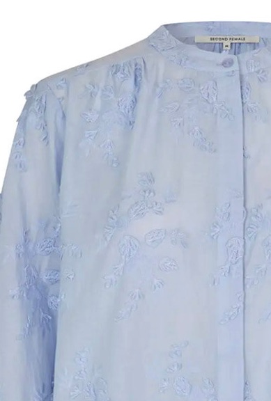 Upgrade your wardrobe with this elegant shirt from Second Female. Crafted from lightweight, breathable cotton with a tone-on-tone embroidered pattern for a subtle, refined look. The shirt features a round neckline, hidden button placket, and long sleeves with ruched cuffs that create a stylish puff-sleeve effect. Its relaxed fit makes it both comfortable and on-trend – perfect for everyday wear or special occasions.