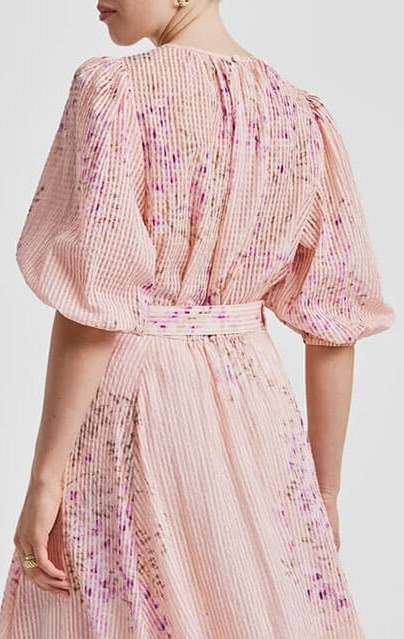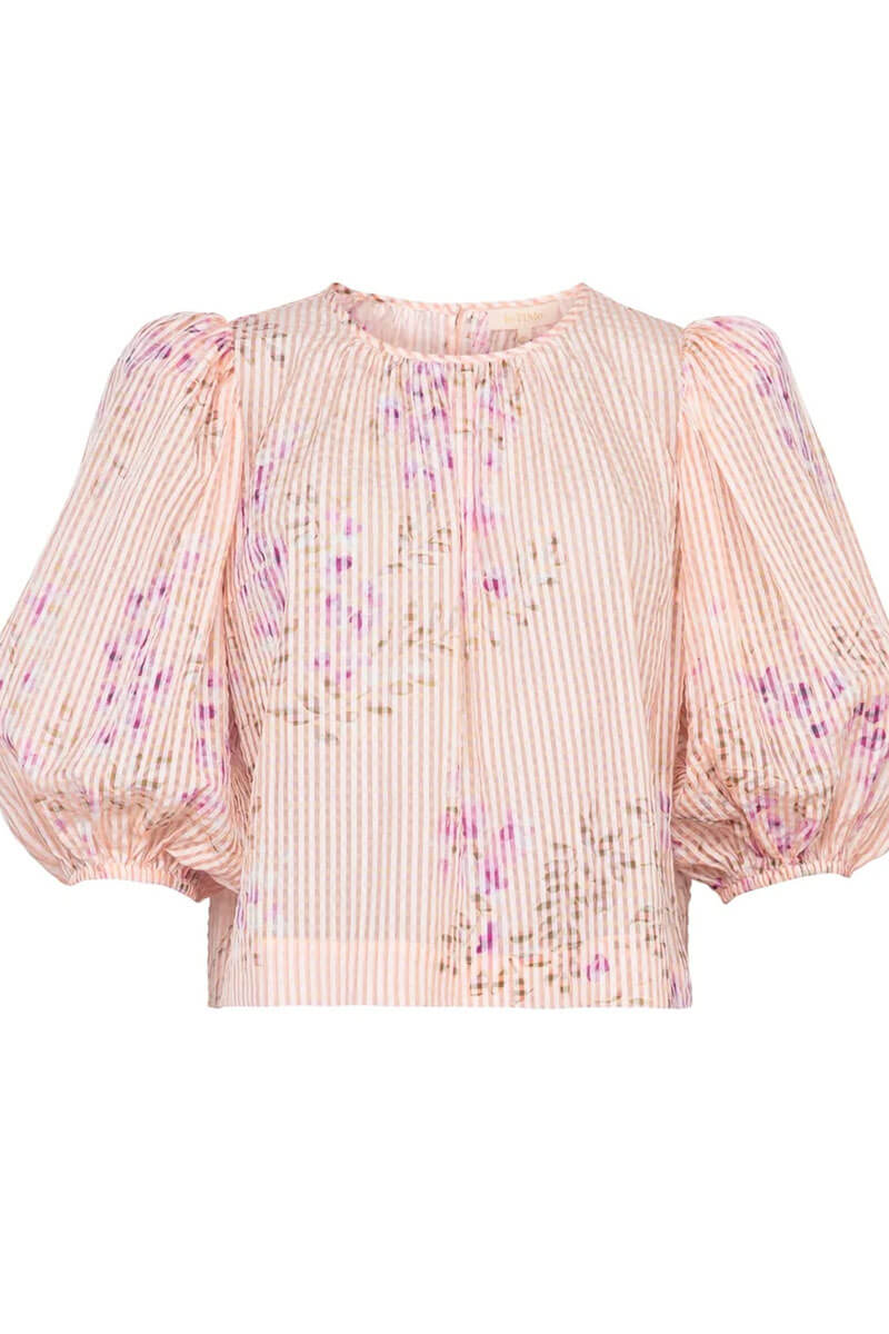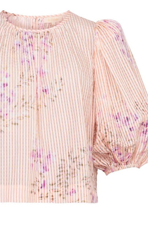 The top has a relaxed silhouette, round neckline and elbow length sleeves with elastic cuffs. The back features a key hole that closes at the top with a button.