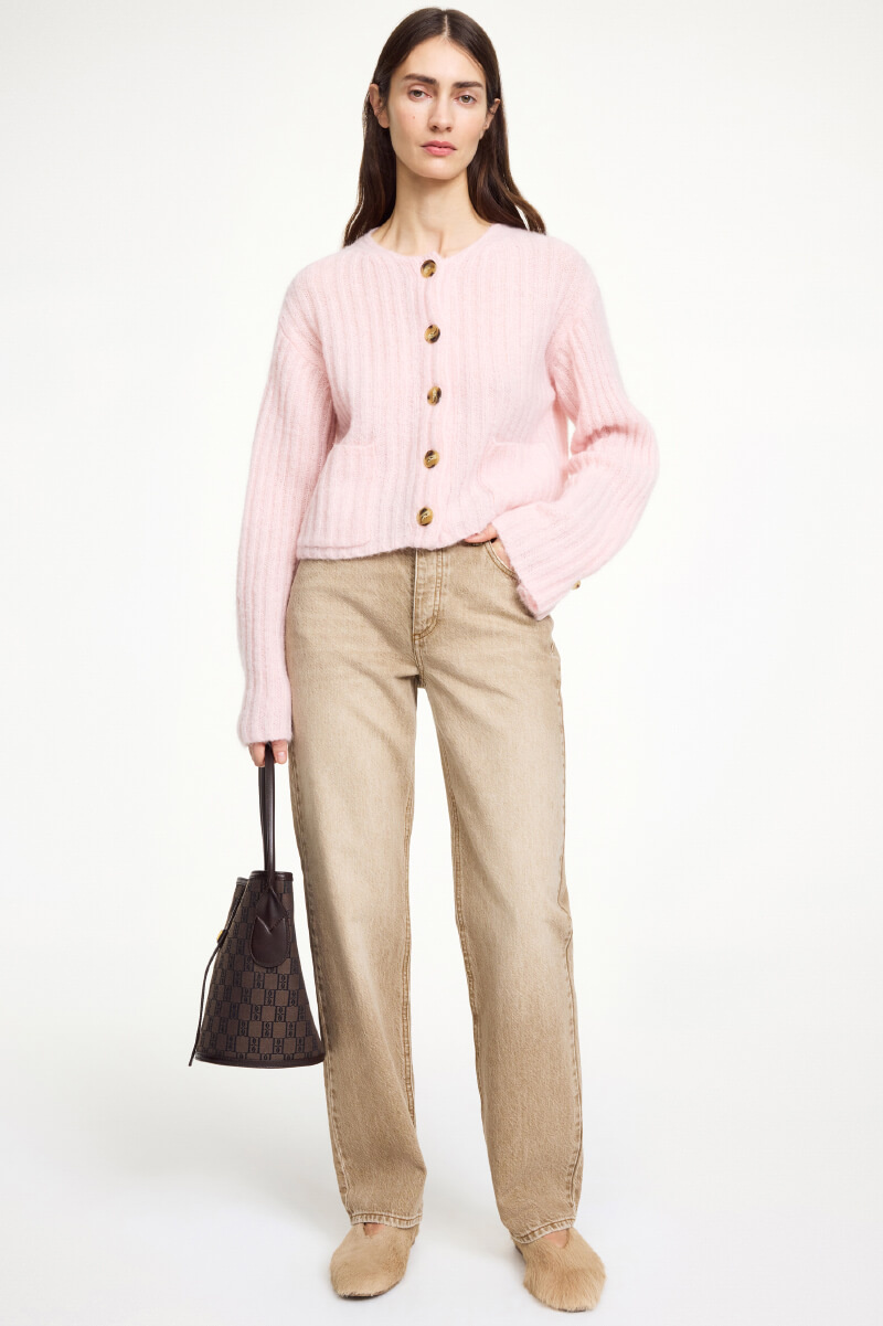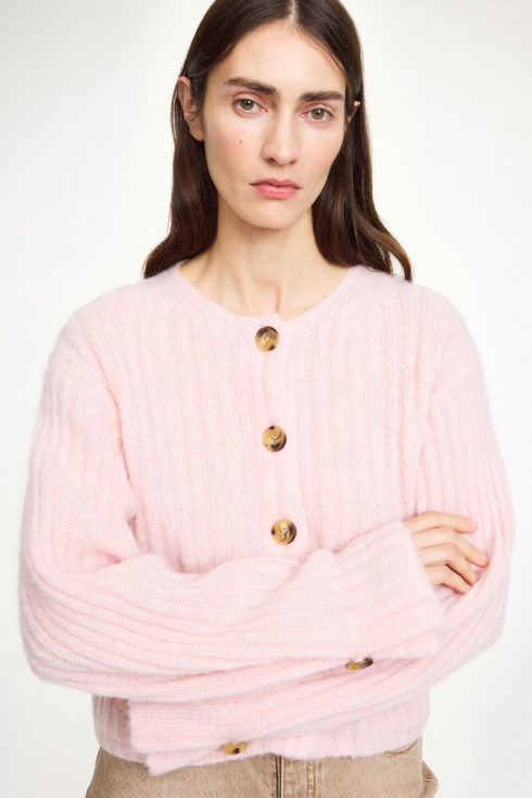 Light pink ribbed cardigan with buttons and pockets – think casually open over a tank top and silk trousers, or buttoned up as a top with high-waisted jeans. The loose fit gives a casual look that still feels thoughtful and soft.Knitted cardigan in a wool blend with a round neckline, wide sleeves, slightly short model, dropped shoulder seams, pockets front, button closure and a relaxed fit from By Malene Birger.