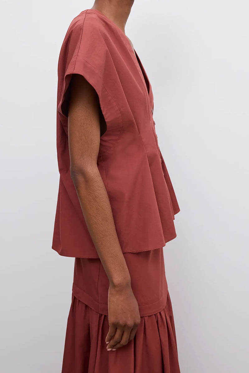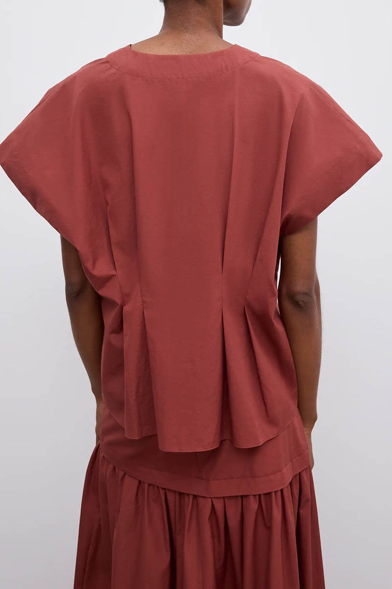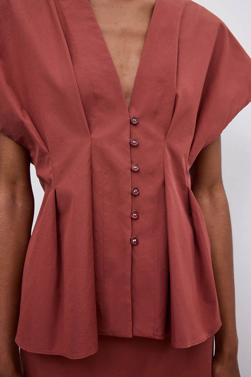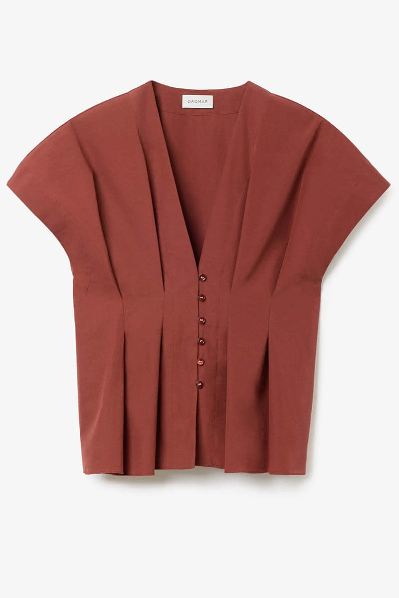Lovely top with pleats and small buttons in front.Pleated top in organic cotton with a soft hand feel and relaxed silhouette, shaped by a v-neckline, deep-set cap sleeves, and gentle cinching through the body.