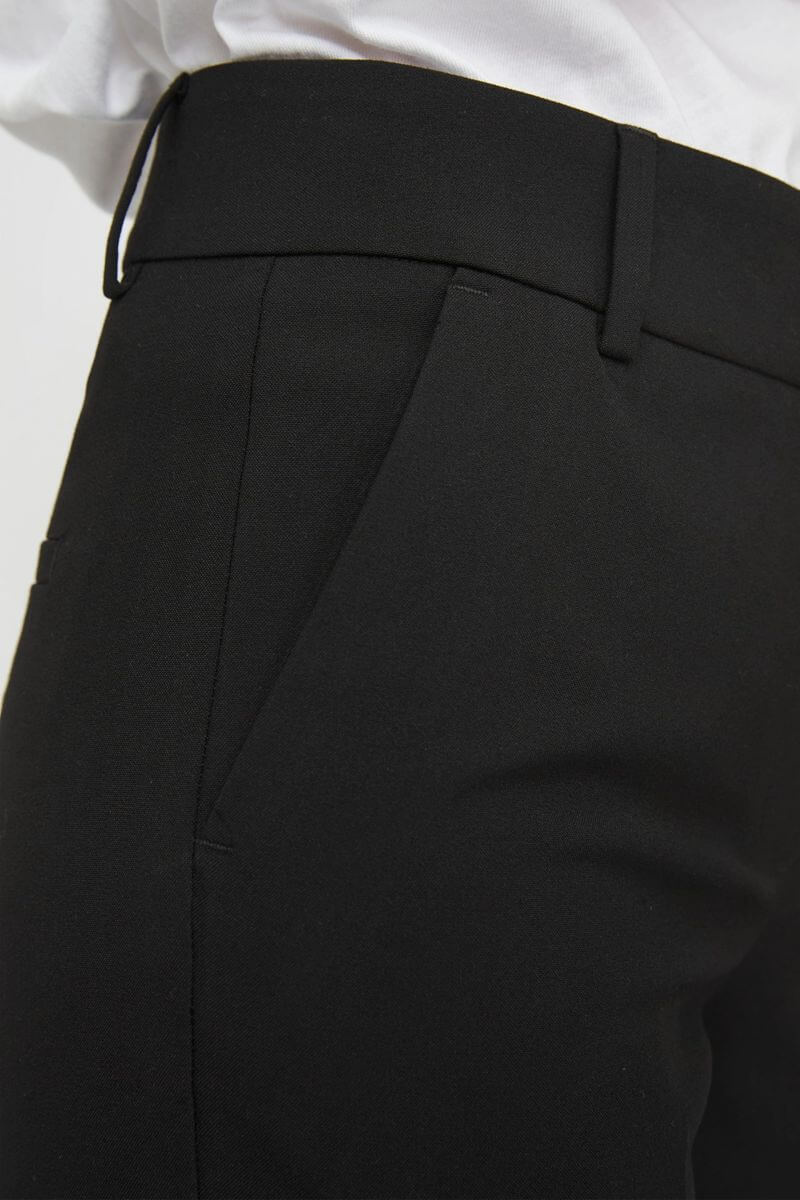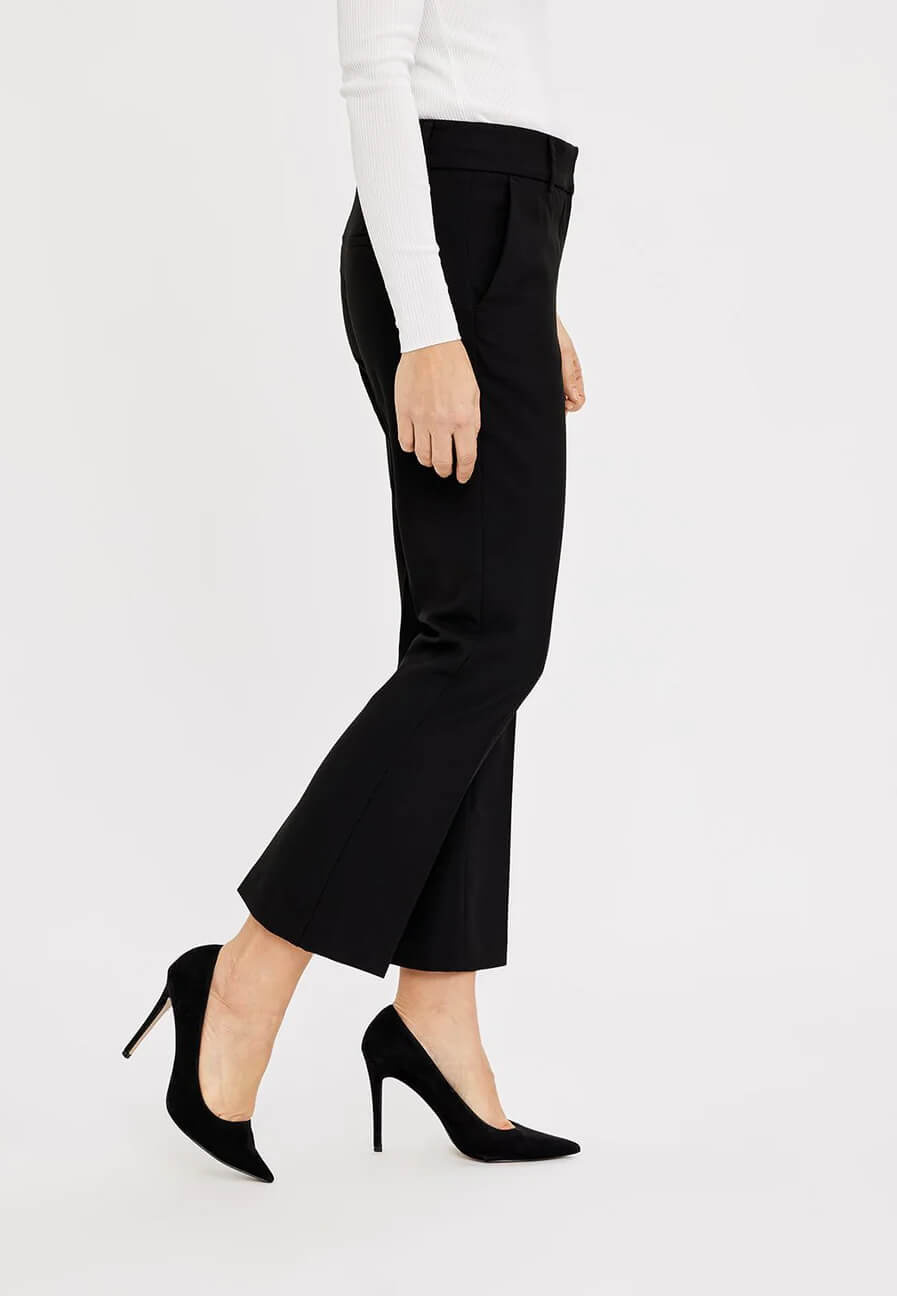 Soft pant with mid waist, pleated front, ankle length, kick flare, normal in sizes, pockets on the side from FiveUnits.63% Polyester 32% Viscose 5% Elastane