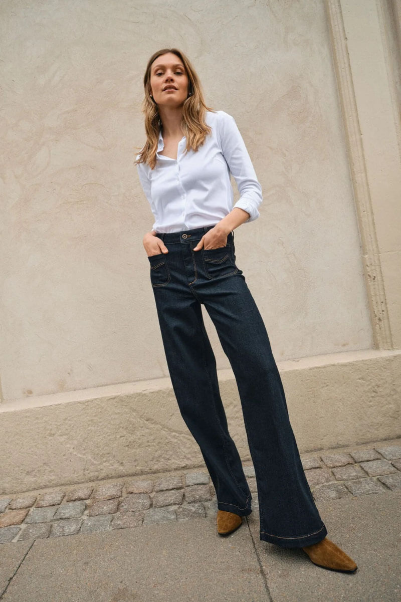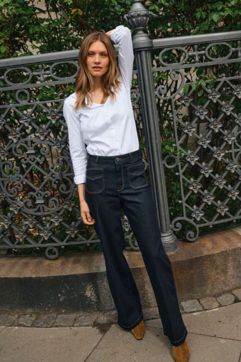 The dark blue flare-fit jeans are a timeless piece that works just as well for everyday wear as for the weekend. Pair them with a simple top and loafers for a relaxed look, or with a blazer and heels for a more dressed-up style.