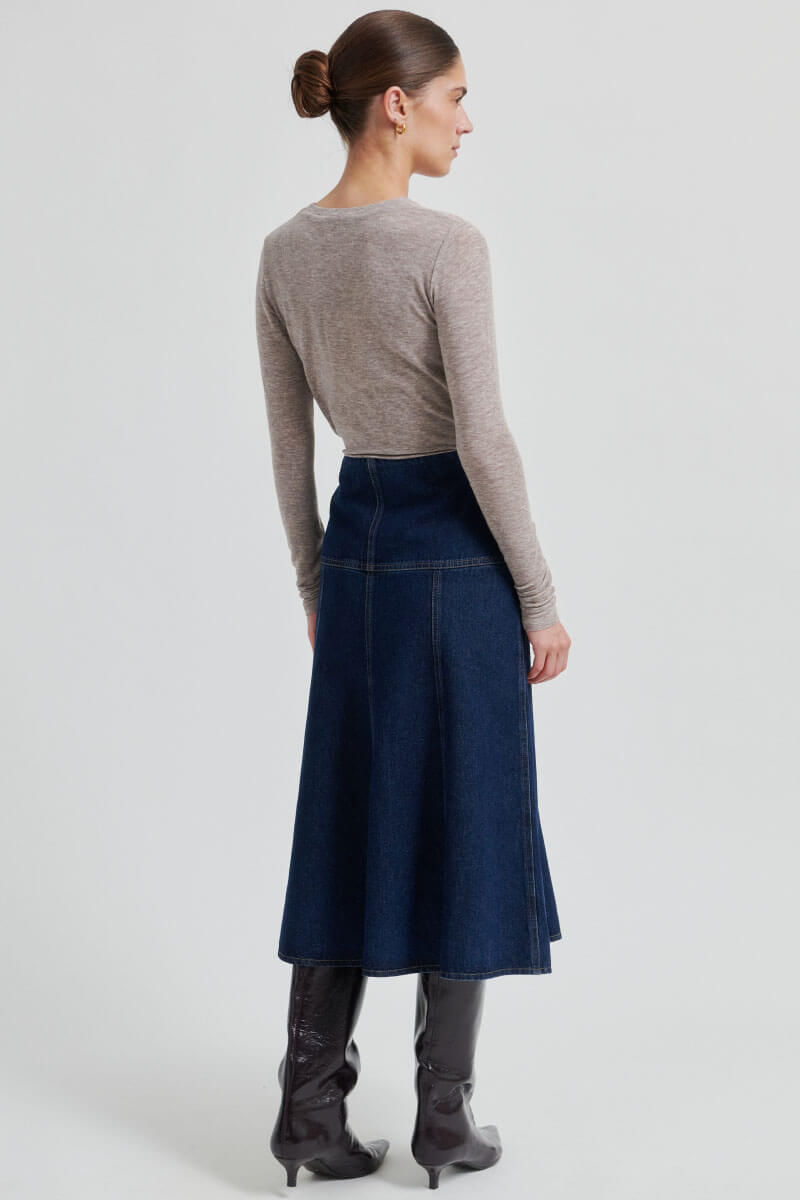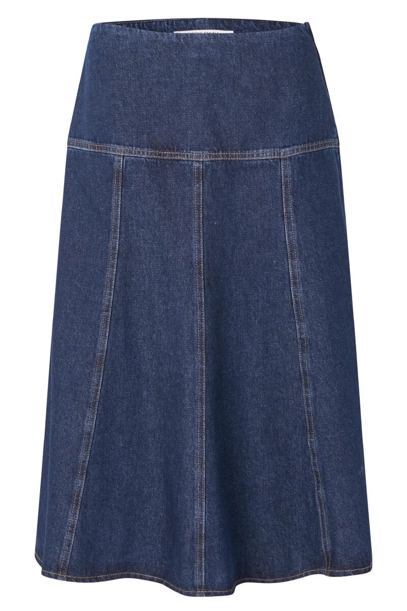 Dark blue denim skirt with contrast stitching, concealed back zip, and vertical seam detailing from Second Female.- True to size, fitted at the waist with a subtly flared silhouette