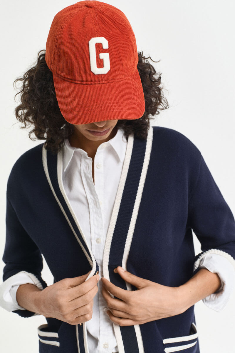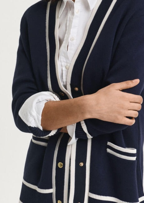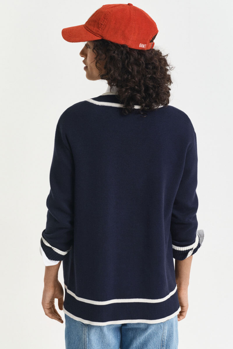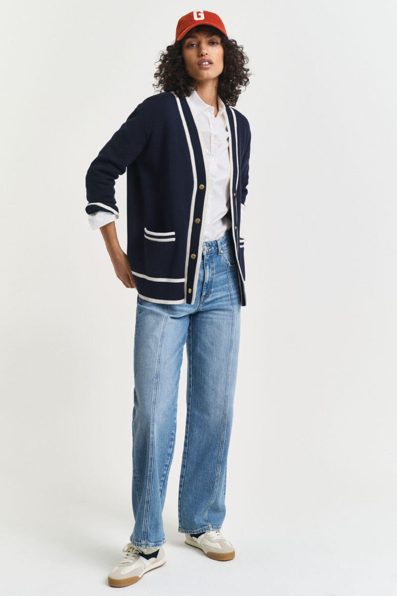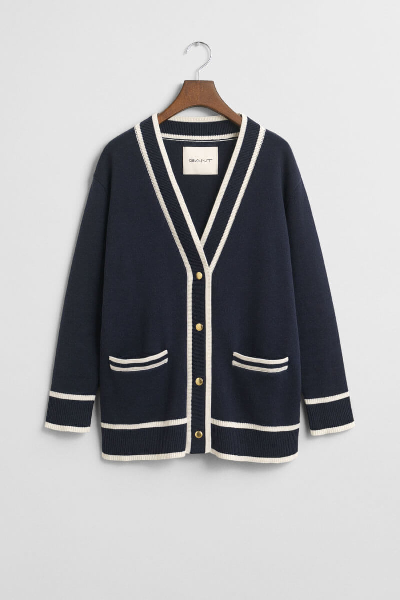 Classic cardigan in navy blue - perfect with jeans or a skirt for a stylish, timeless look. Timeless knitted cardigan with a preppy twist you always want to have close by. Elevate every outfit with simple elegance.Knitted cardigan in organic cotton with contrasting color edge, relaxed fit, front button closure, v-neck and front pockets from Gant.