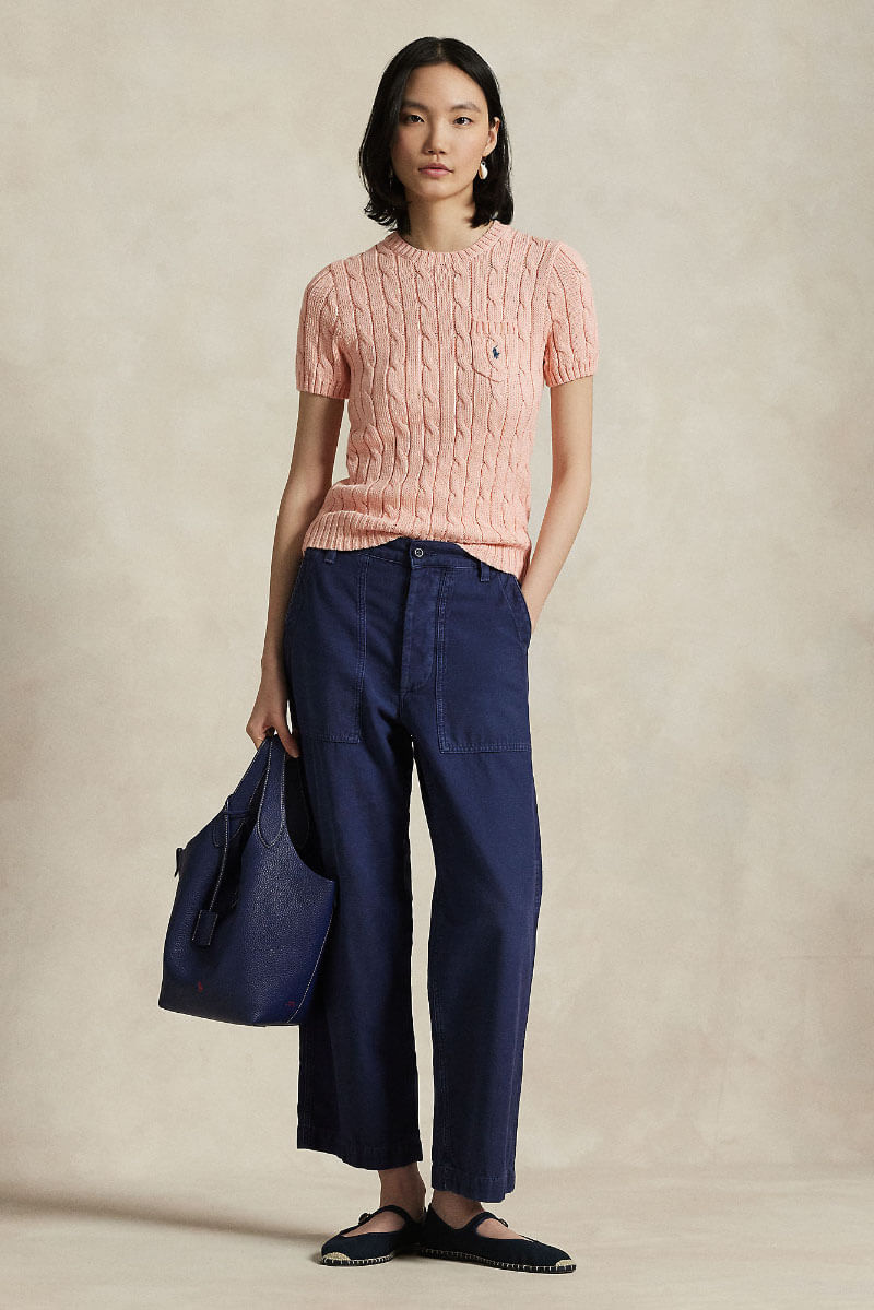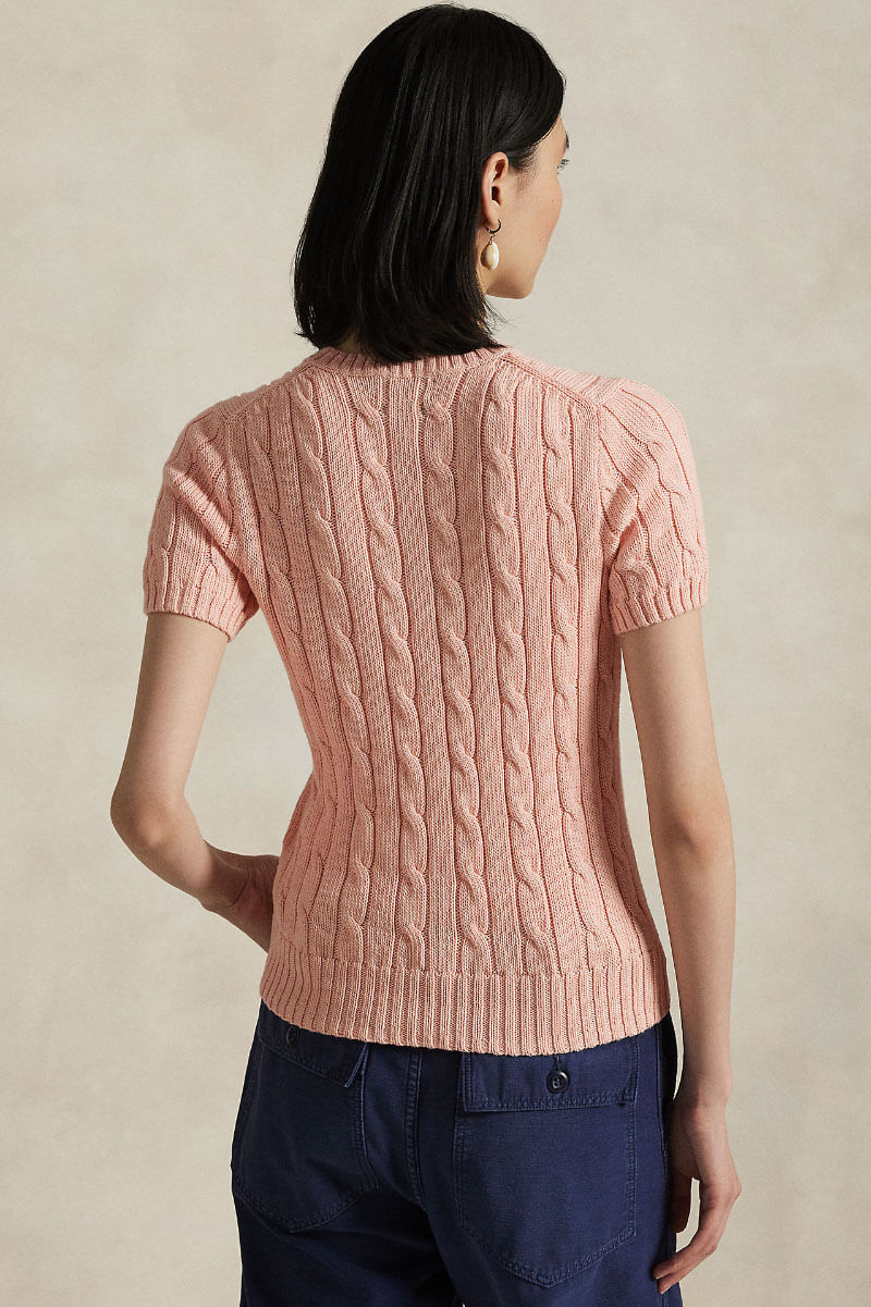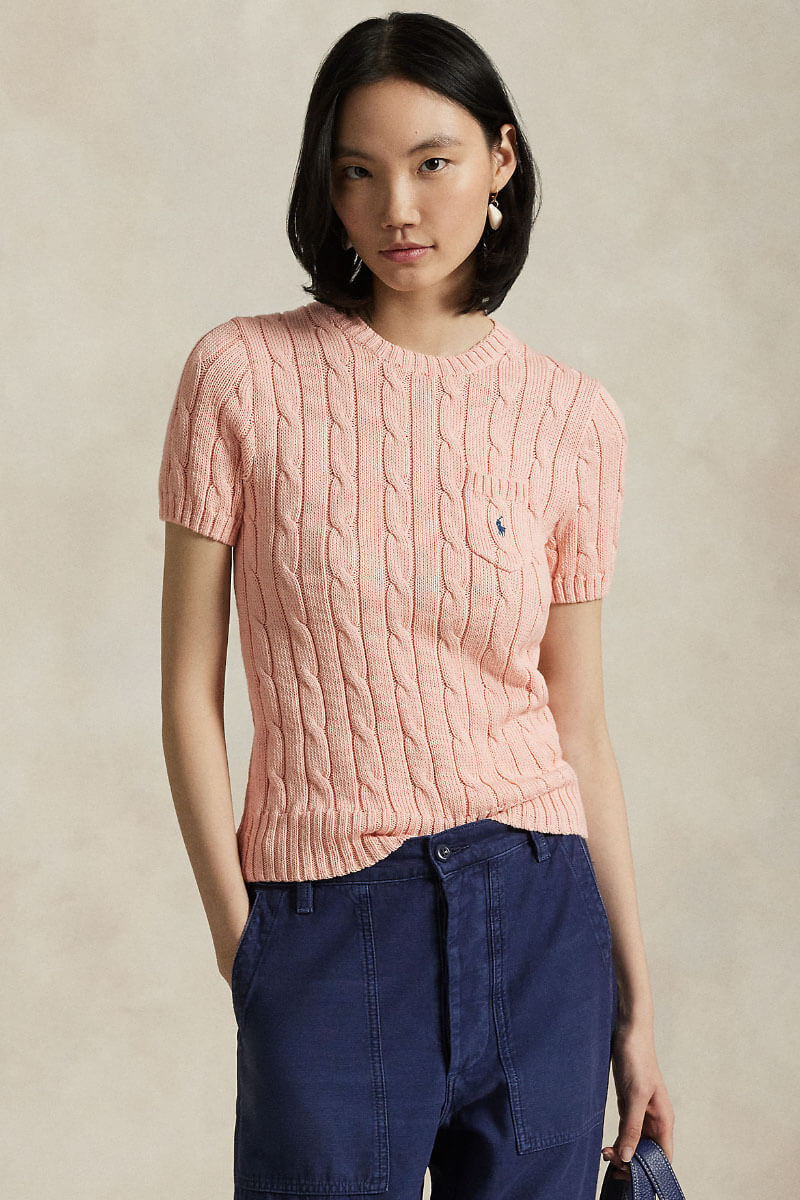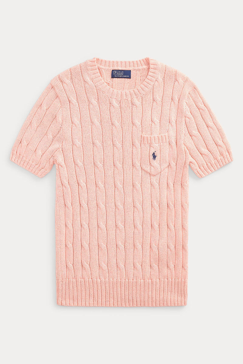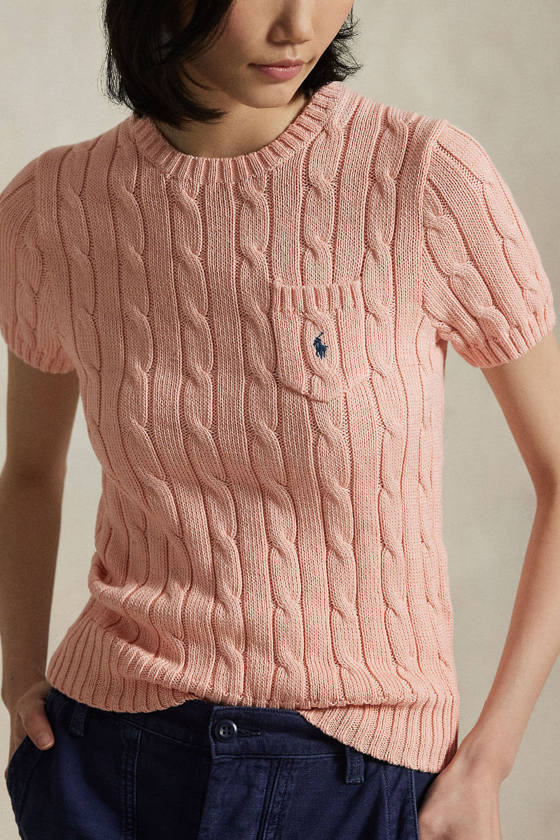 A cable knit top in a soft light pink shade and a figure-hugging cut – a stylish piece that will give your outfit a lift. Match with denim or tailored for a balanced look that feels both modern and easy to wear.Cable-knit cotton top with chest pocket, slim fit, round neckline, short sleeves and ribbed edges from Polo Ralph Lauren.