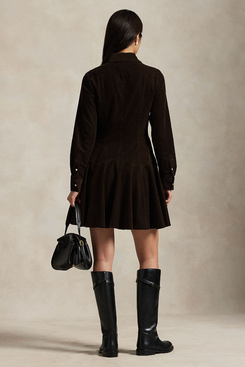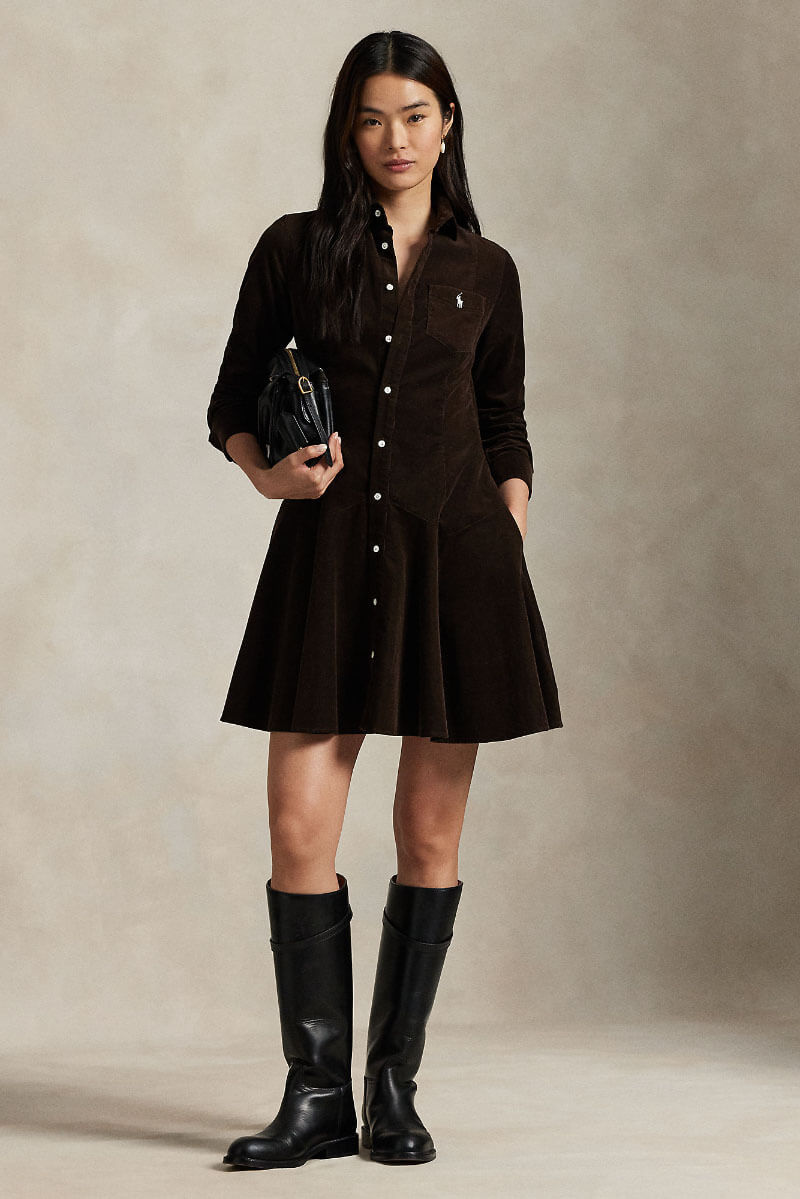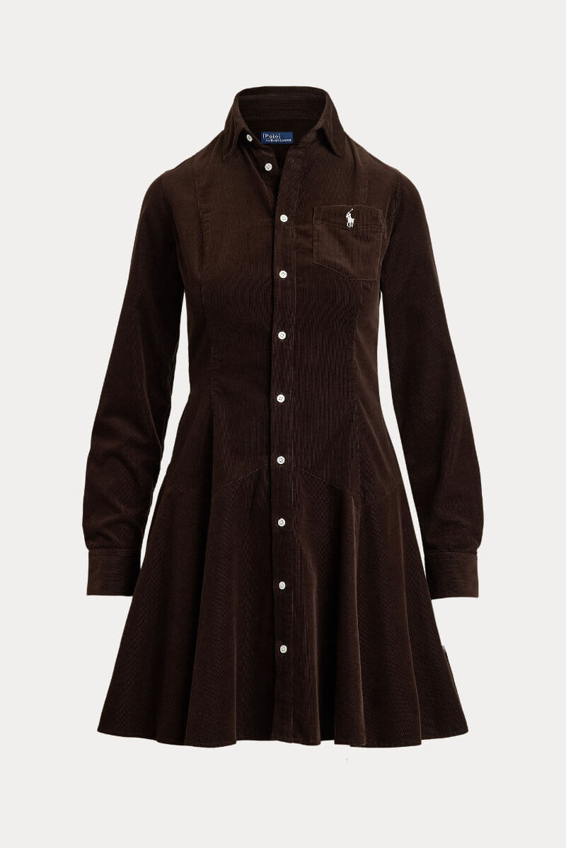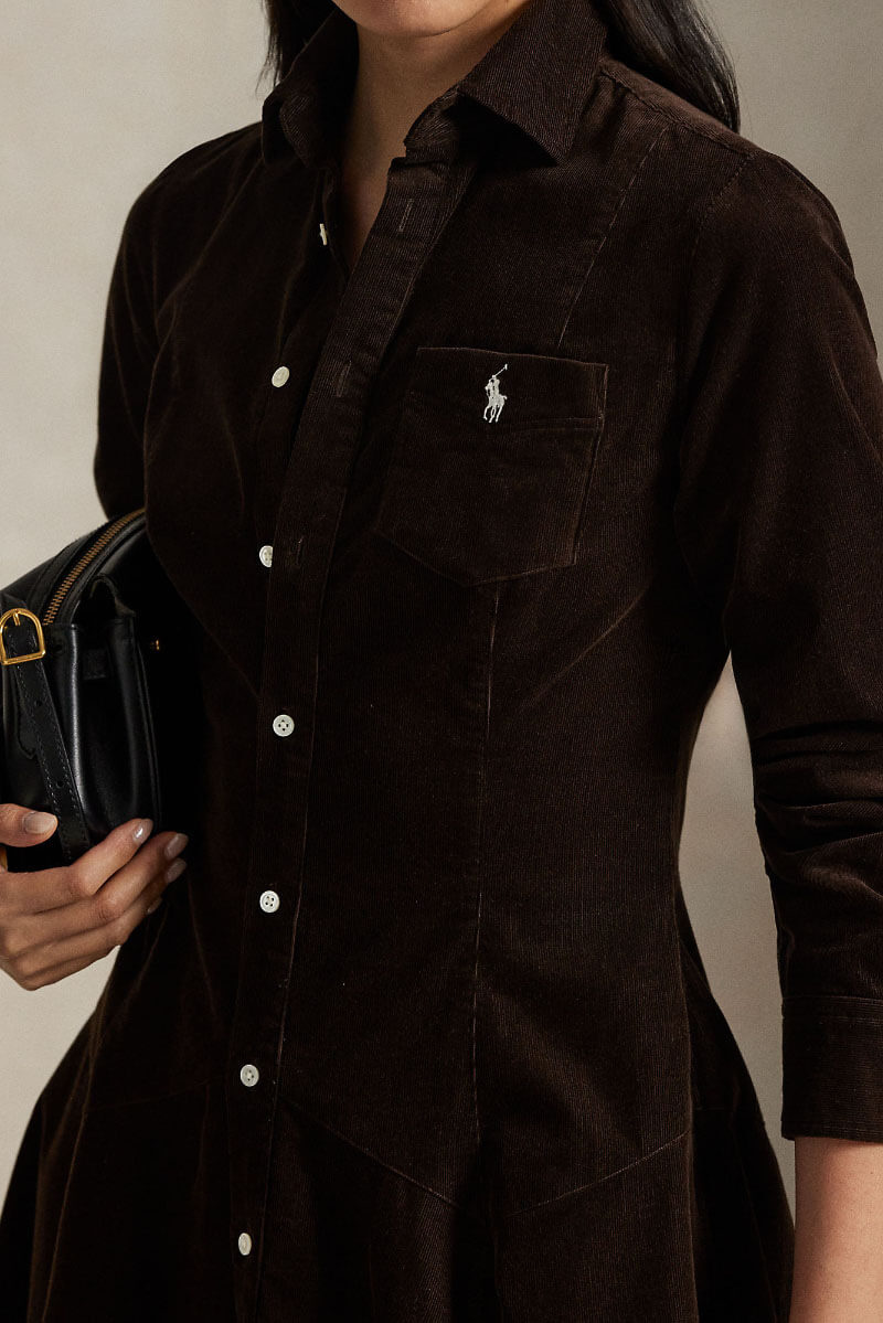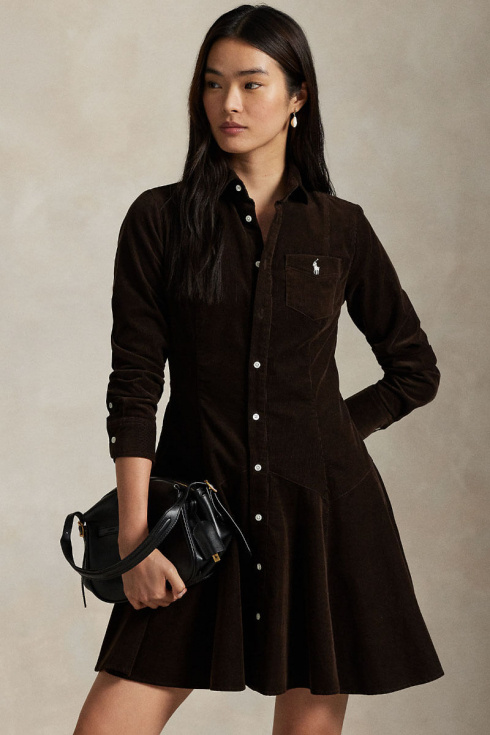 A brown corduroy dress with a collar and knee-length silhouette is the most casually elegant piece of fall. Style with thicker tights and boots for everyday simplicity, or add slim leather belts and high boots for a more sophisticated look with a retro touch.Short corduroy dress with collar, fitted model, button closure at the front and small embroidered logo on the chest pocket from Polo Ralph Lauren.