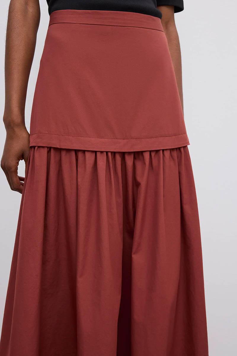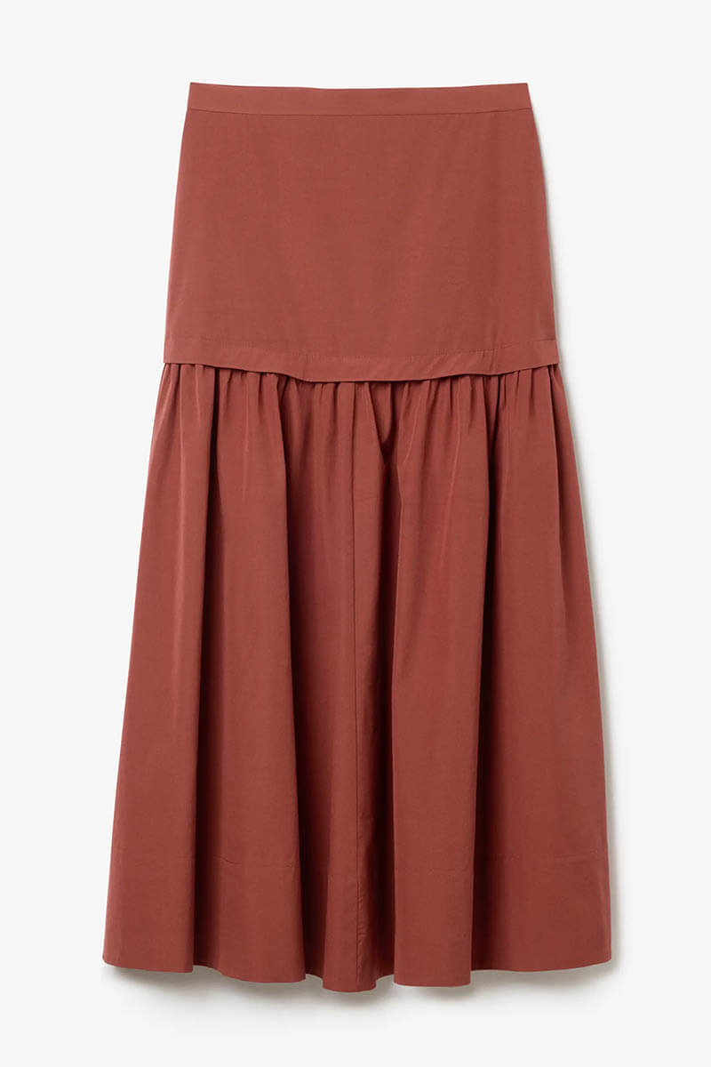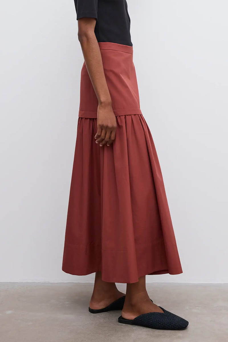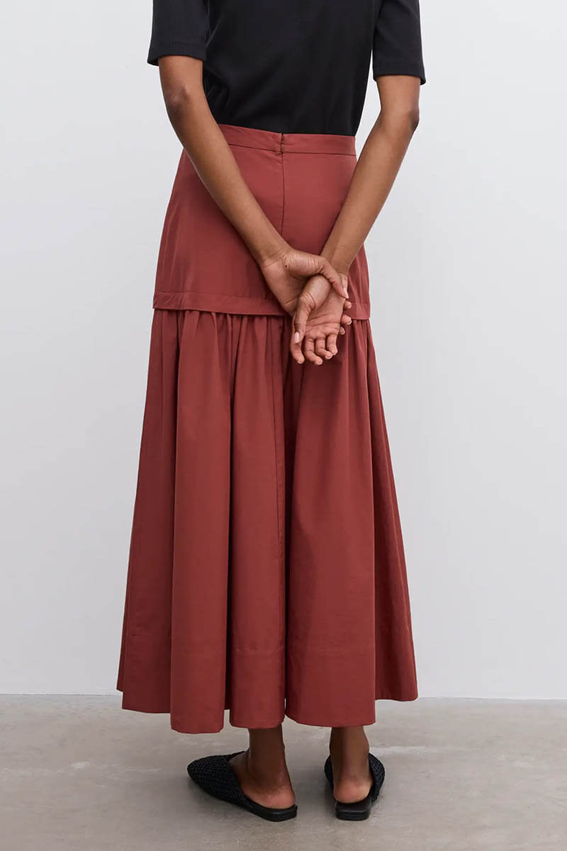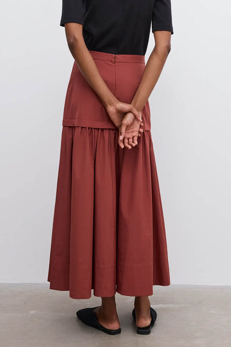 Ankle-length skirt in organic cotton poplin with a soft hand feel and dual construction, formed through a fitted, lined, mid-waist yoke and pleated lower skirt. Complete with a back zip closure.100% Organic cotton