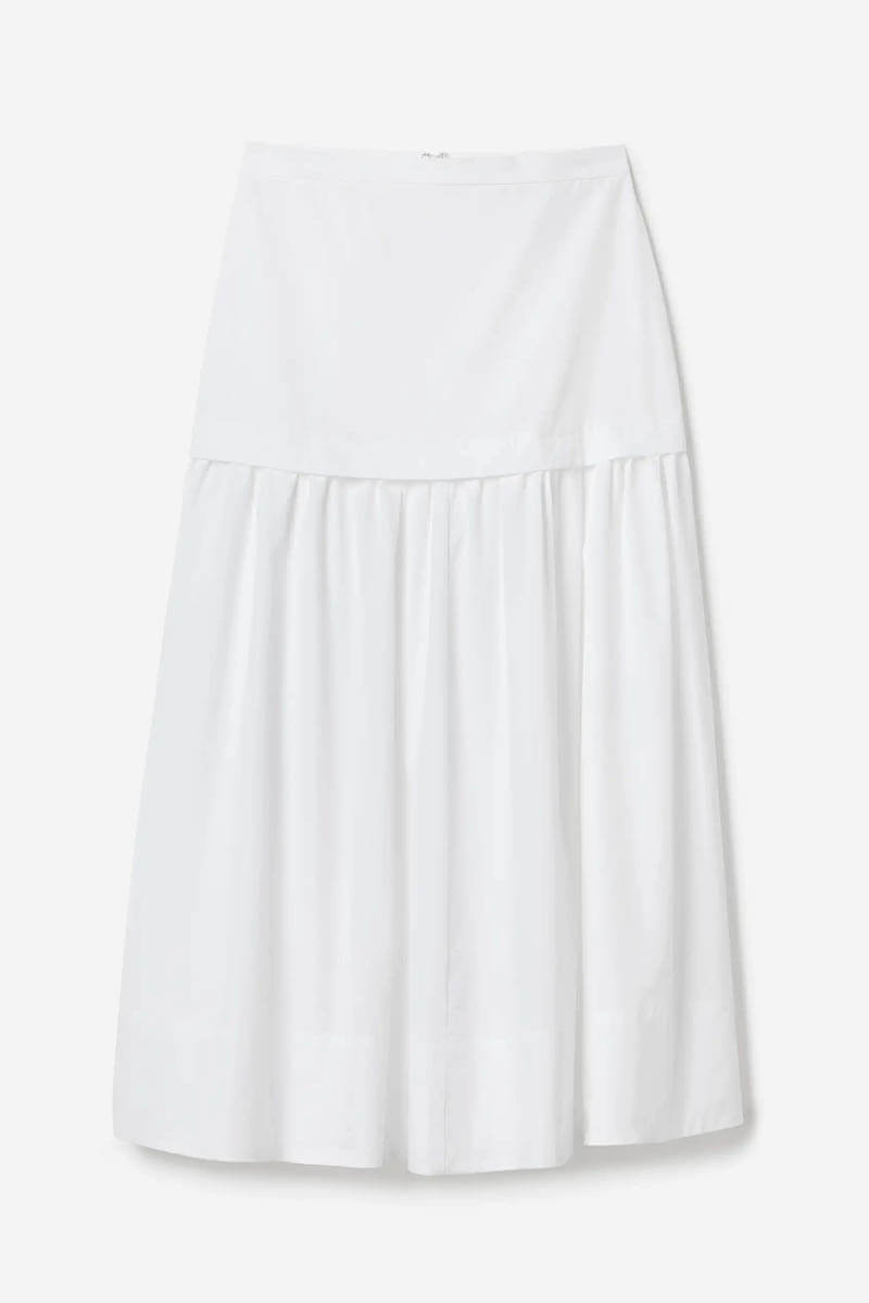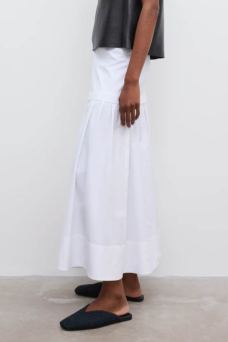 Ankle-length skirt in organic cotton poplin with a soft hand feel and dual construction, formed through a fitted, lined, mid-waist yoke and pleated lower skirt. Complete with a back zip closure.100% Organic cotton