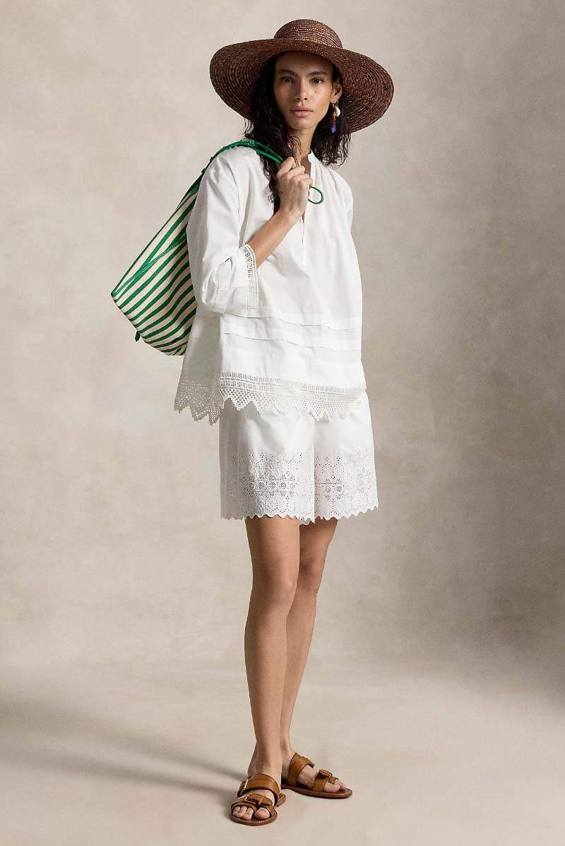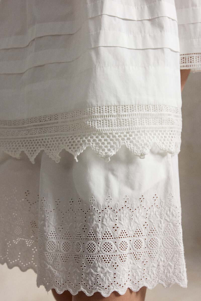 Luxurious cotton blouse with handcrafted lace details. Crafted from soft cotton, this piece offers the perfect balance of comfort and style. The relaxed silhouette is complemented by decorative details such as shirring and tailored pleats, creating a feminine and elegant look.