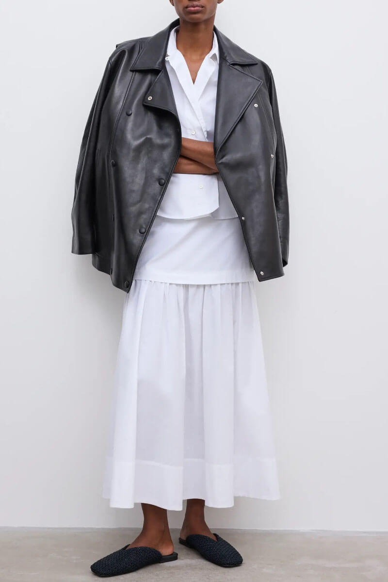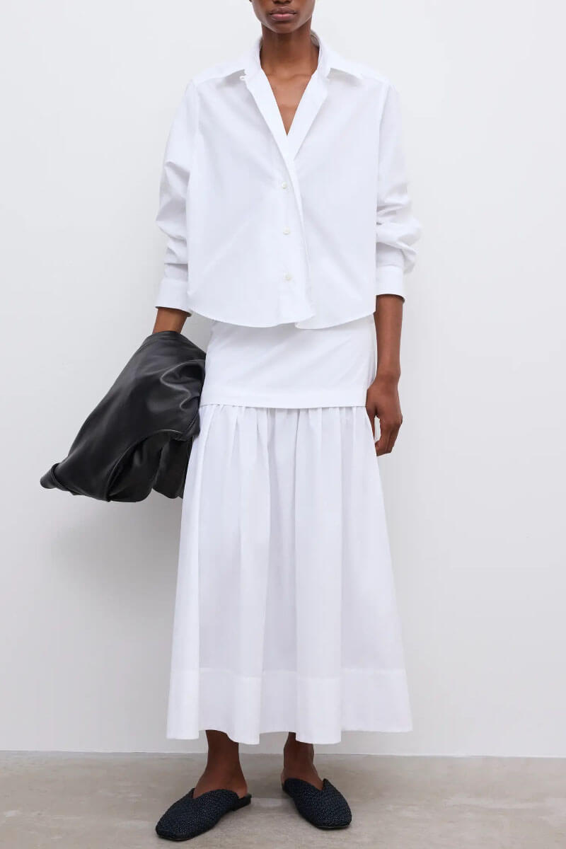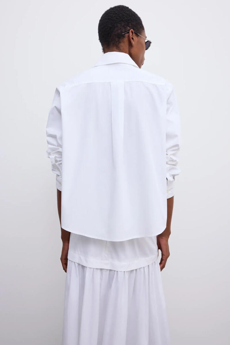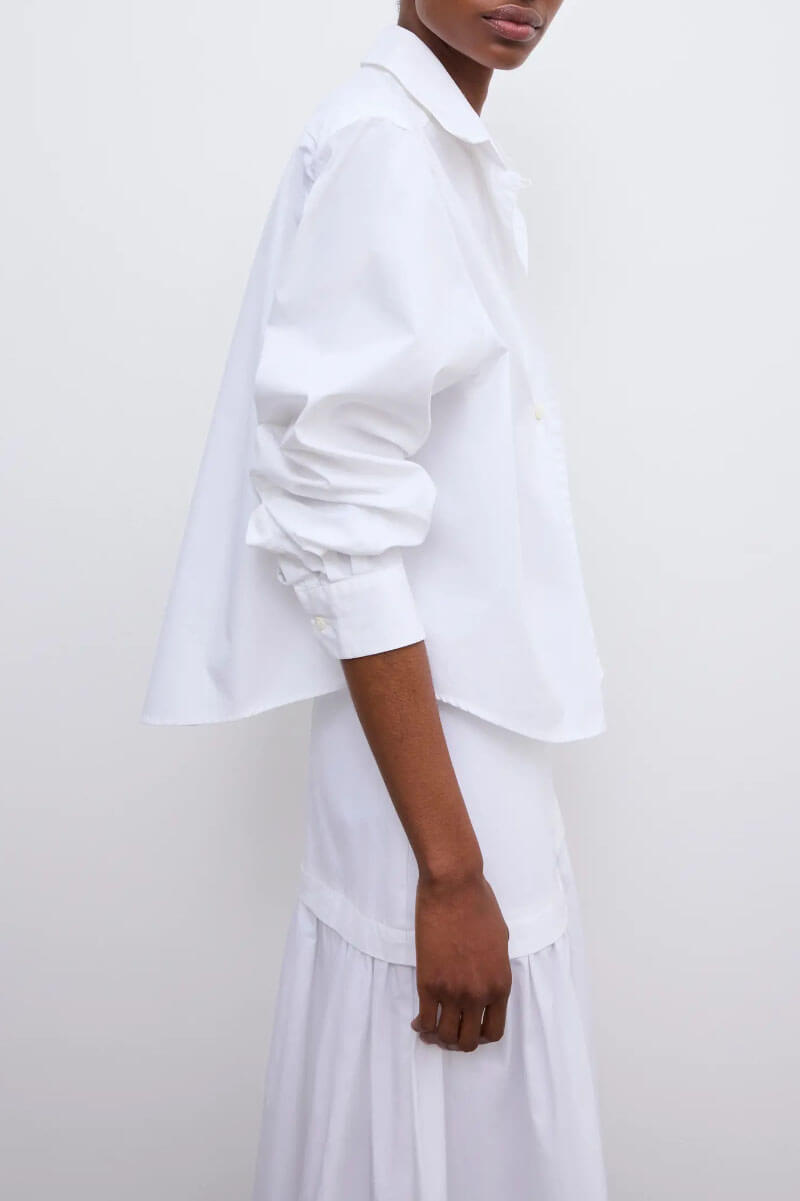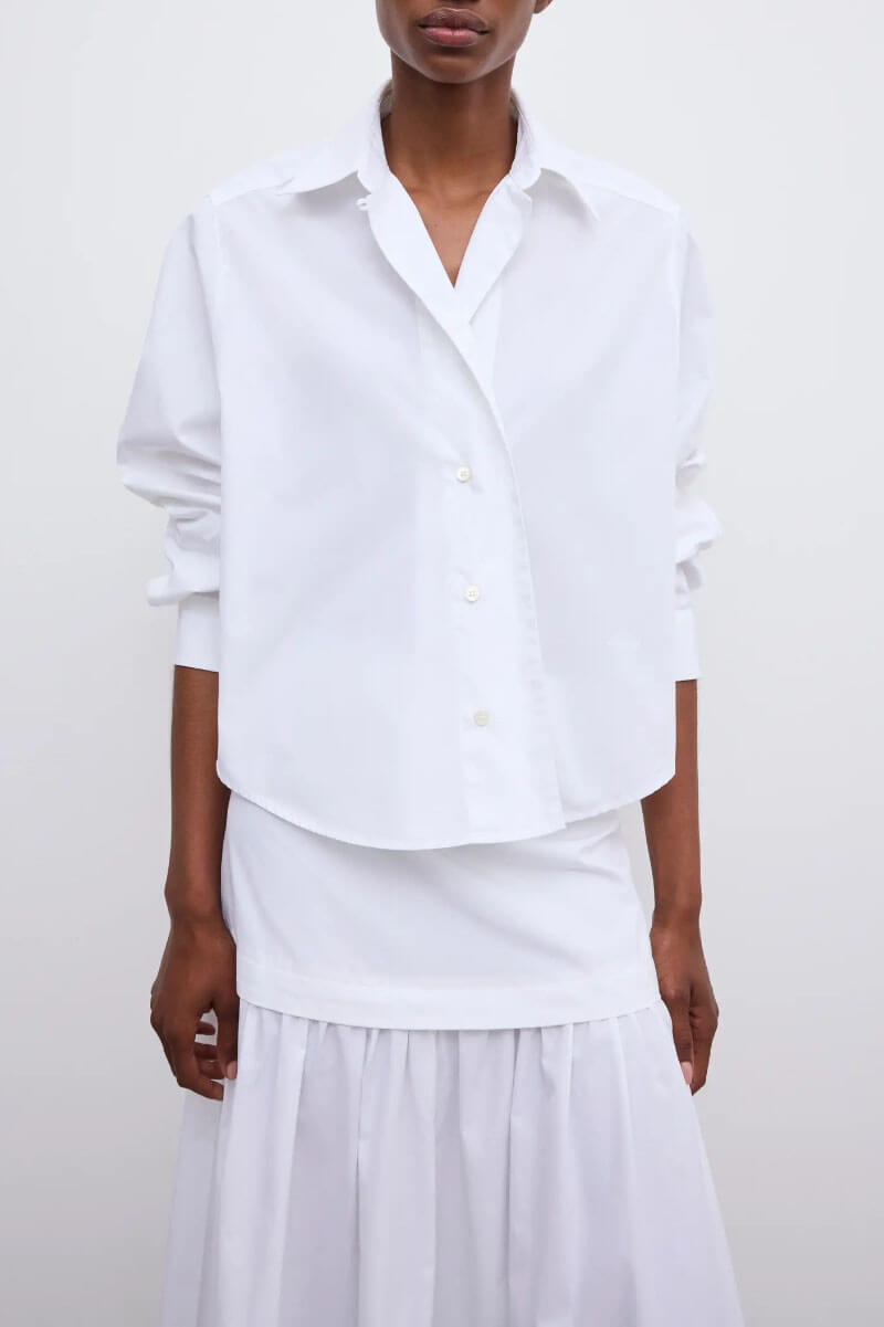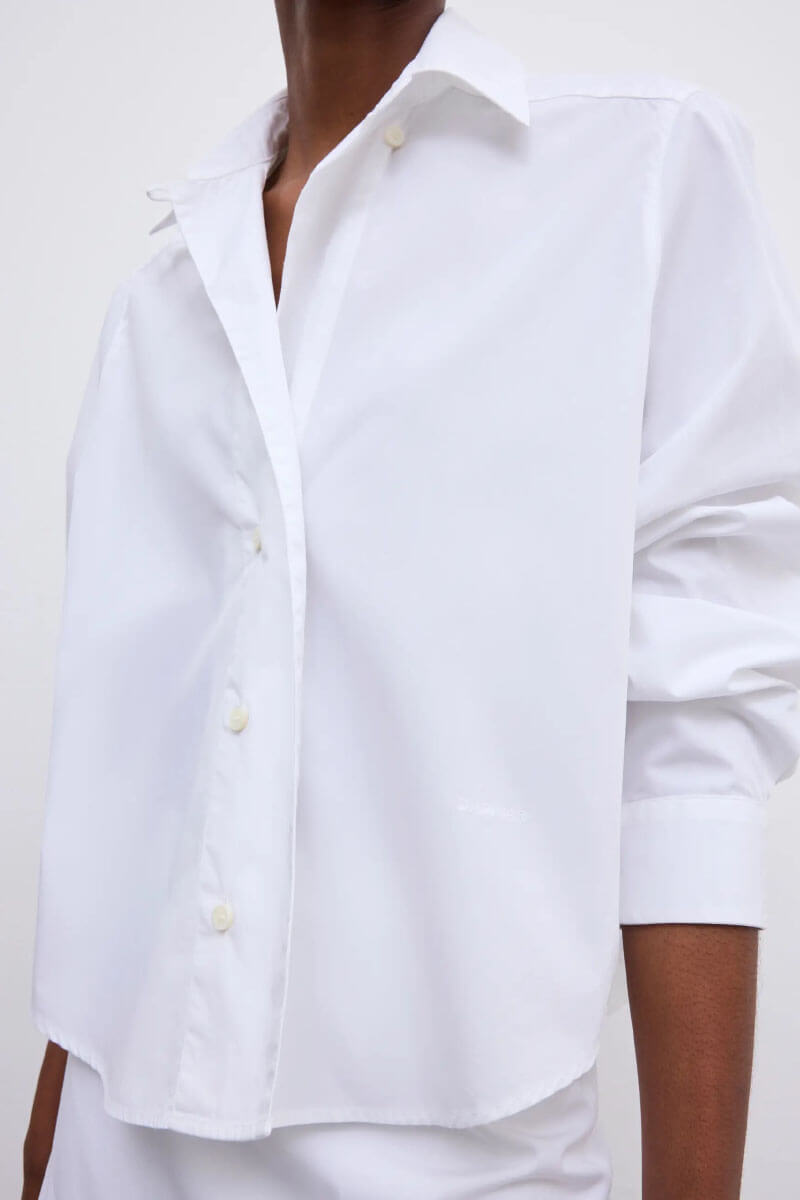 A white shirt in organic cotton that sets the tone for a casual yet stylish look. Wear with tailored trousers, loafers and red lips. A shirt that makes the simple interesting.White shirt in organic cotton with short model, collar, loose fit, asymmetrical front fastening with buttons from Dagmar.