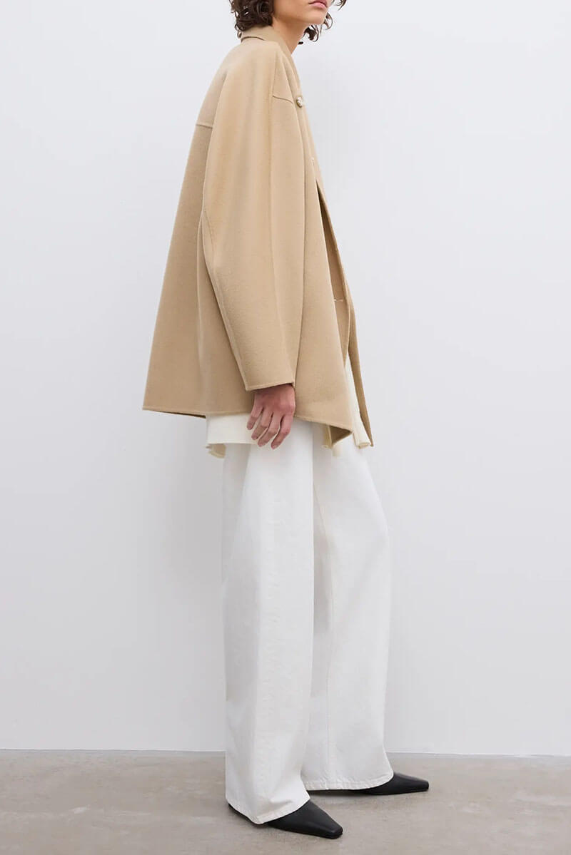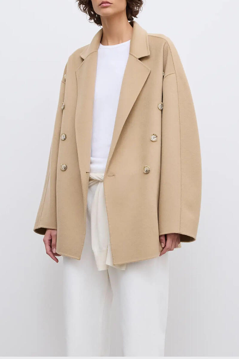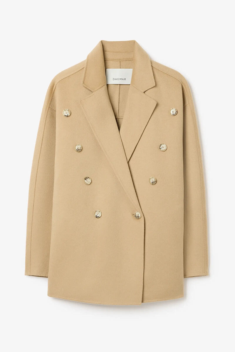 The jacket is double-breasted and fastens with exclusive buttons, specially designed for this style. Discreet in-seam pockets contribute to a clean and thoughtfully crafted design. A perfect choice for those seeking a refined wool jacket with lasting quality and timeless elegance.