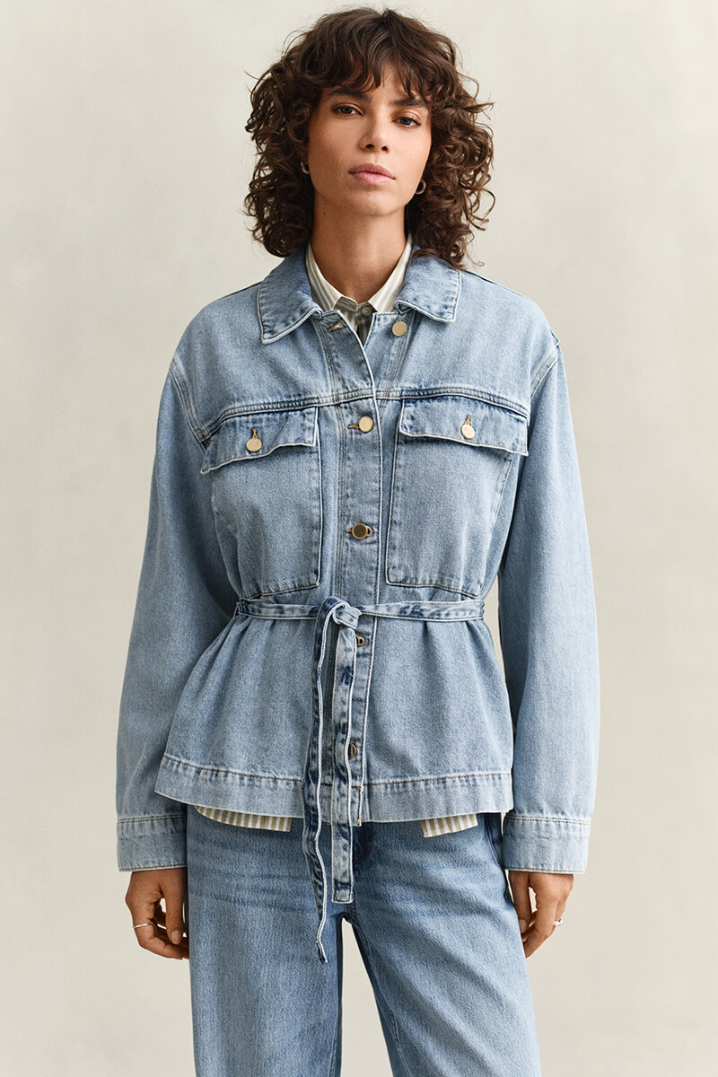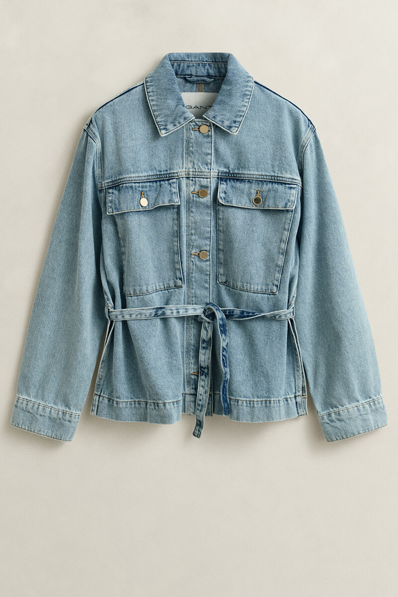 Hip-length denim jacket with chest pockets, buttoned cuffs, and an integrated fabric belt. The design features a relaxed fit and a genuine denim feel.