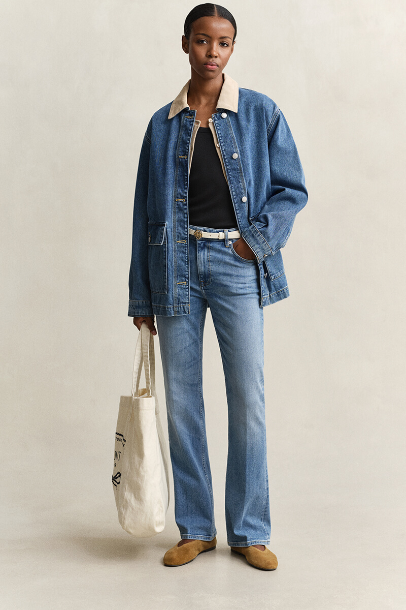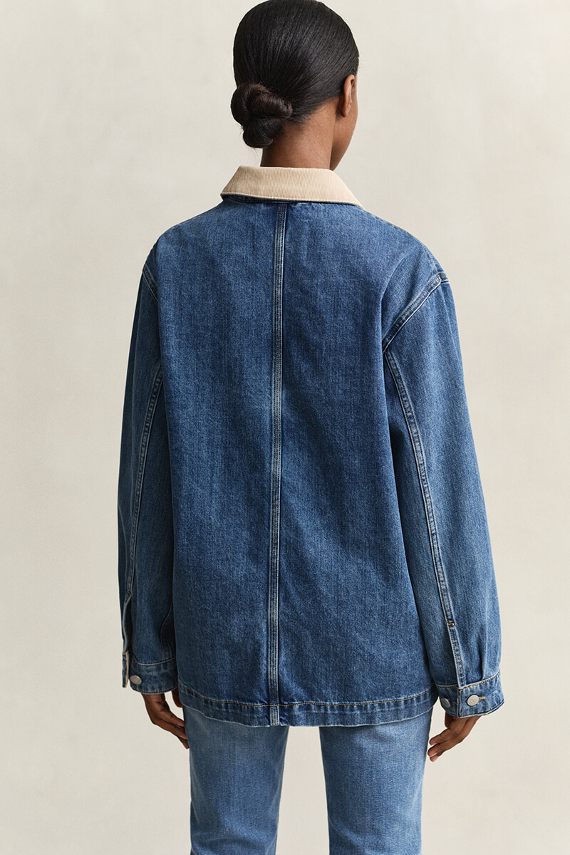 It has adjustable cuffs with snap buttons, patch pockets with flaps at the front, and classic logo denim buttons, details that create a clean and functional look.