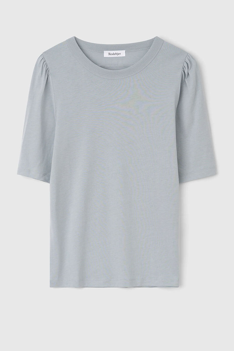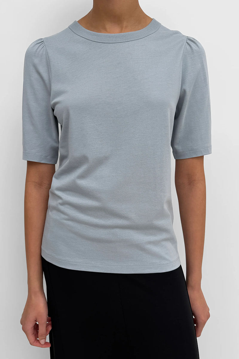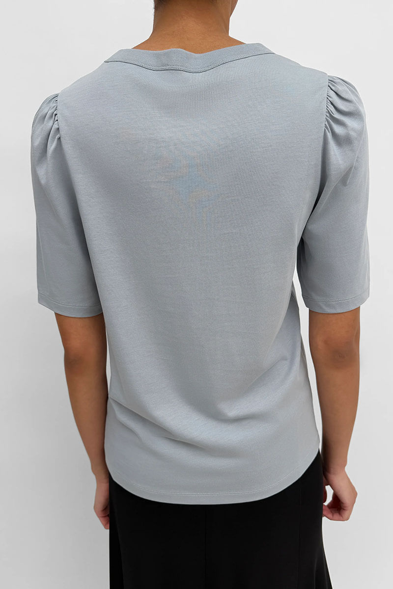 • Crew neck, short sleeves with gathered mini-puff at shoulders