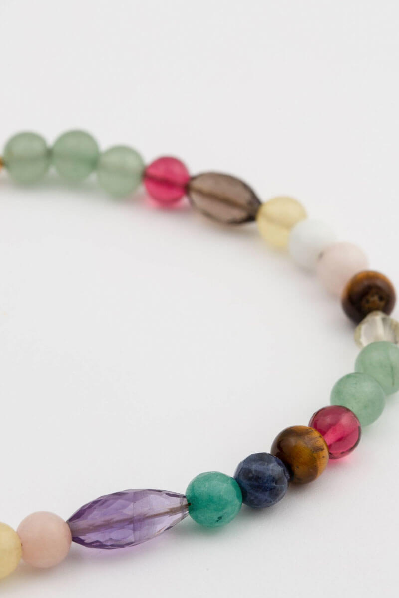 - The stones used are jade, ruby quartz, smoky quartz, yellow jade, white agate, pink opal, tiger's eye, lemon quartz, sodalite, amazonite and amethyst