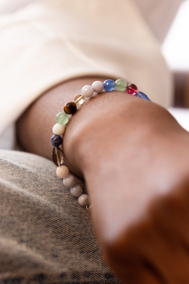 - The stones used are blue agate, pink opal, smoky quartz, sodalite, white agate, green jade, tiger's eye, blue chalcedony, ruby quartz, yellow agate