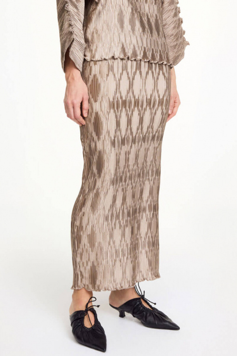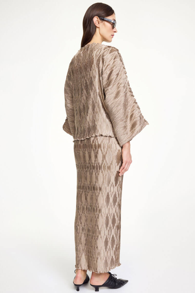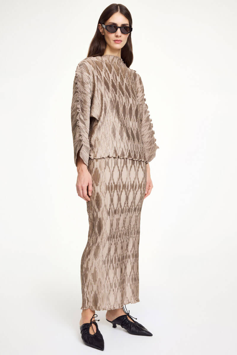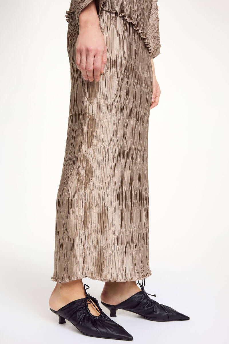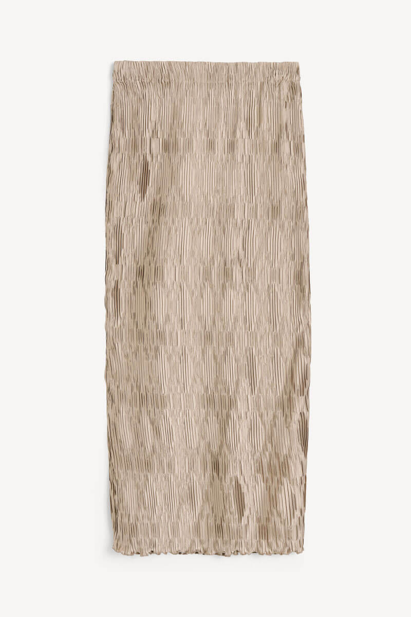 A pleated skirt in shimmering taupe that moves like liquid light. Wear with the matching blouse for a modern two-piece silhouette, or style with a white t-shirt for contrast. Add heels – or sneakers, if you dare.Maxi skirt in nicely flattering pleats with elastic waistband, ankle length and regular fit from By Malene Birger.