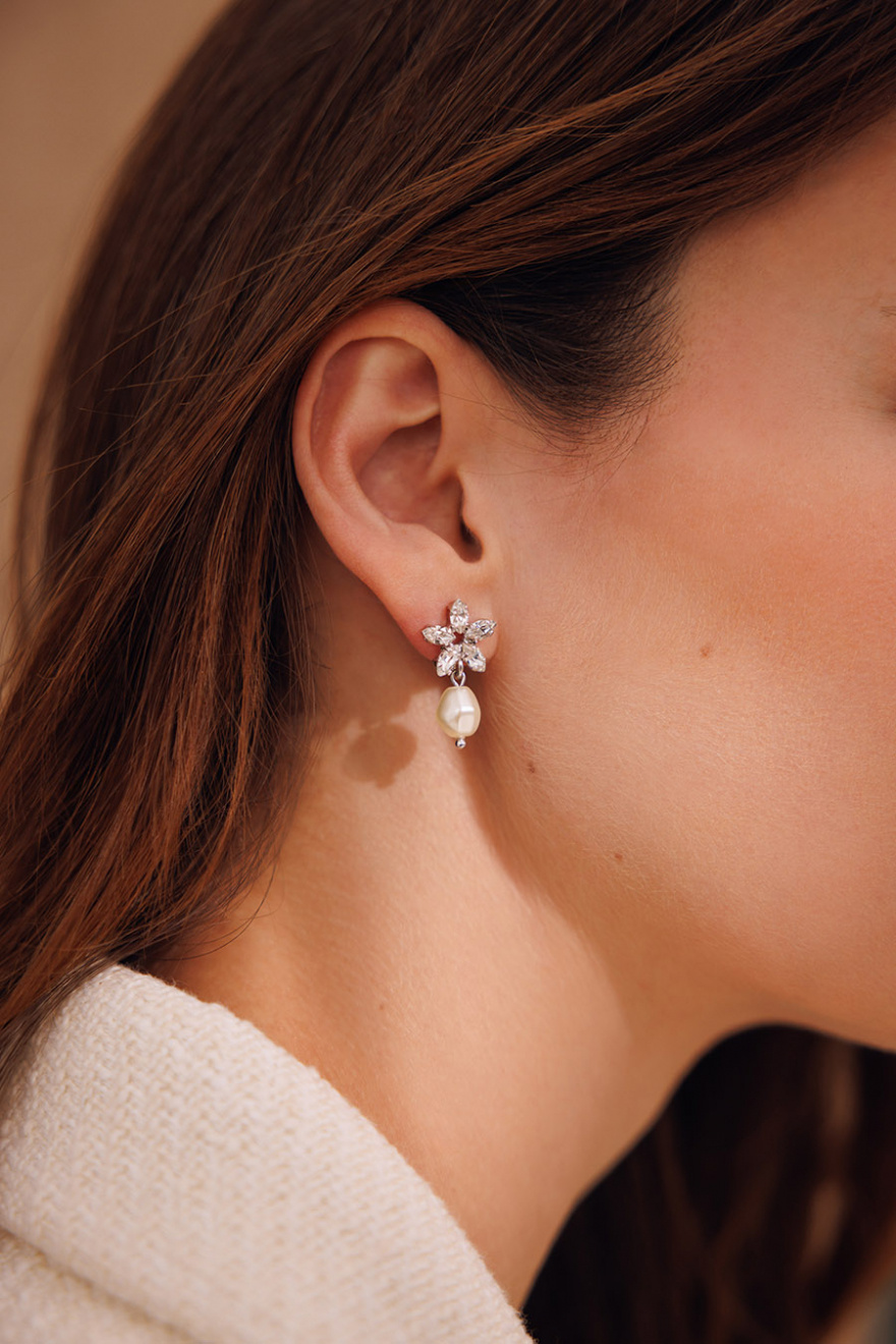 Emmy Earrings, Rhodium & Pearl / Crystal